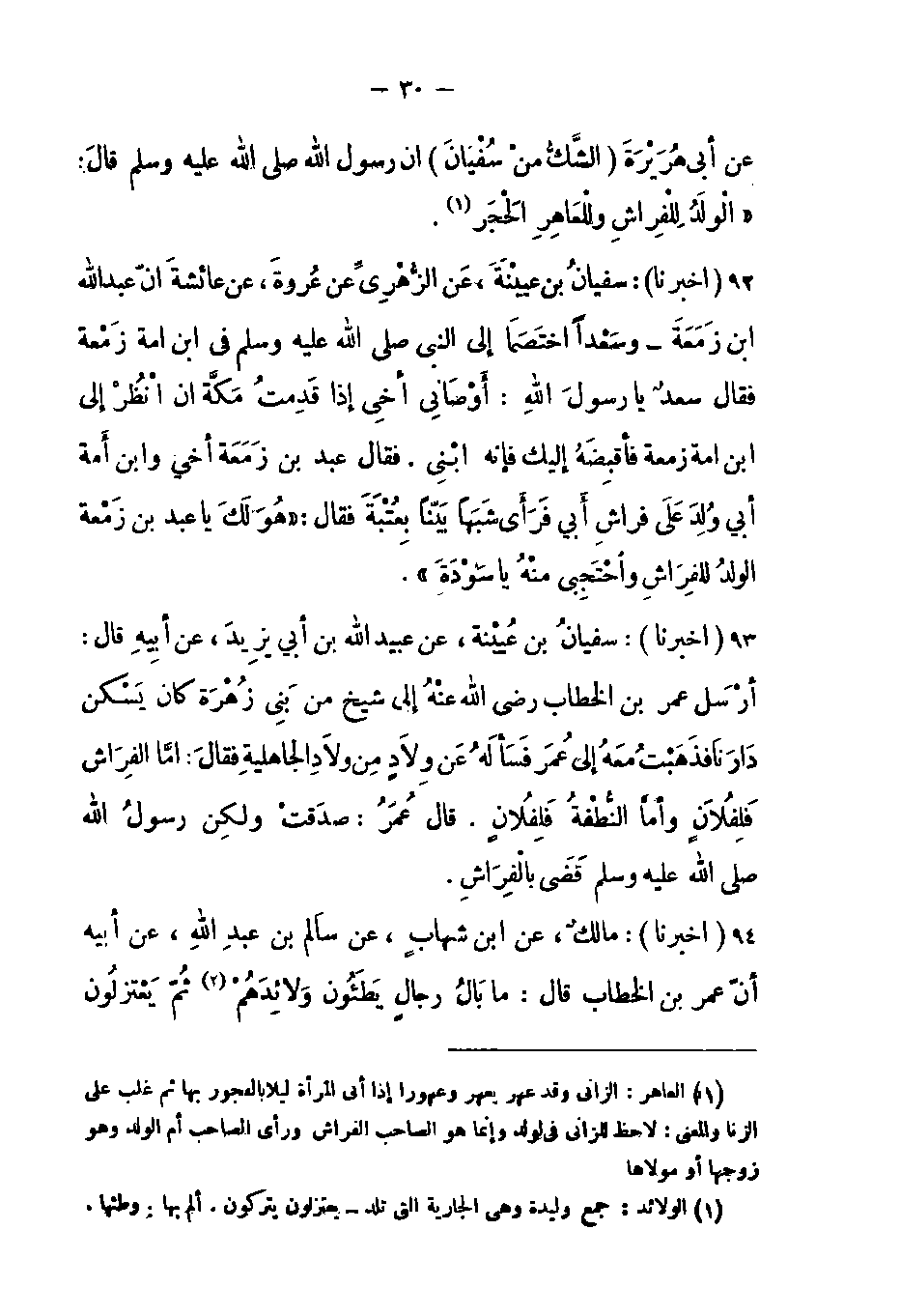 -أرْسَل عمر بن الخطاب رضي الله عنه إلى شيخ من بَني زُهْرَة كان يَسْكن دَارَنا فذَهبْتُ معَهُ إلى عُمَر فَسَأَلَهُ عَن وِلاَدٍ مِن وِلادِ الجاهليةِ فقالَ: أمَّا الفِرَاش فَلِفُلانٍ وأمَّا النُّطْفةُ فَلِفُلانٍ قال عُمَرُ: صدَقتْ ولكِن رَسُولَ اللَّهِ صَلَّى اللَّه عليه وسلَّم قَضَى بِالفِرَاش.