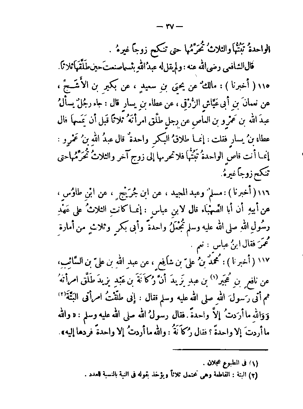 -جاء رجلٌ يسألُ عبدَ الله بن عَمْرٍو بن العاصِ عن رجلٍ طلَّقَ امرأتَهُ ثلاثاً قَبل أن يَمَسَّها قال عطاء بنُ يسارٍ فقلت: إنما طلاقُ البكرِ واحدةٌ قال عبدُ اللهِ بنُ عَمْرٍو: إنما أنت قاصٍ الواحدةُ تَبُتُّها فلا تحرمها إلى زوج آخر والثلاثُ تُحَرِّمُها حتى تنكح زوجاً غيرهُ.
