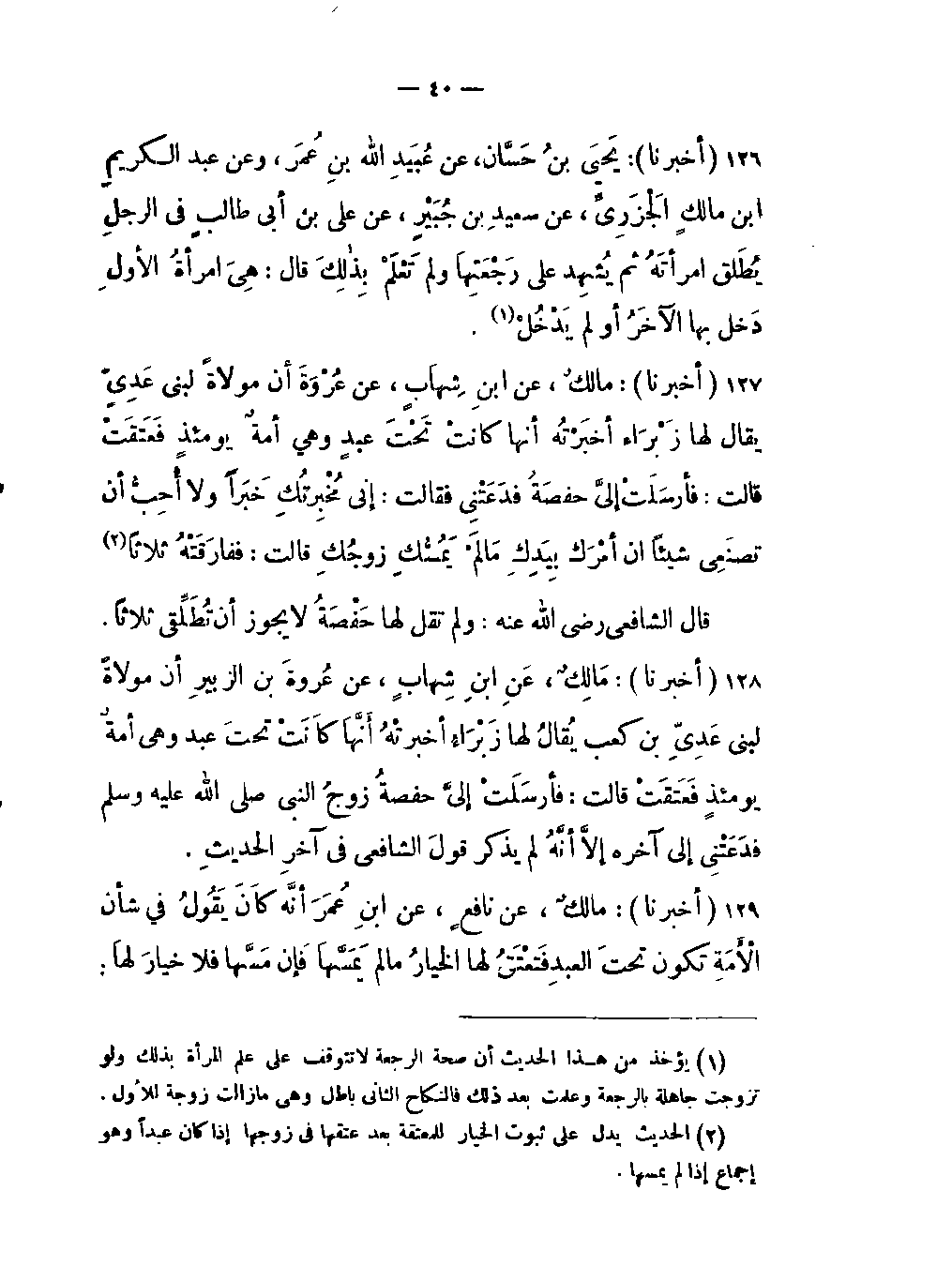 129- (أخبرنا) : مالكٌ، عن نافعٍ، عن ابنِ عُمَرَ:
