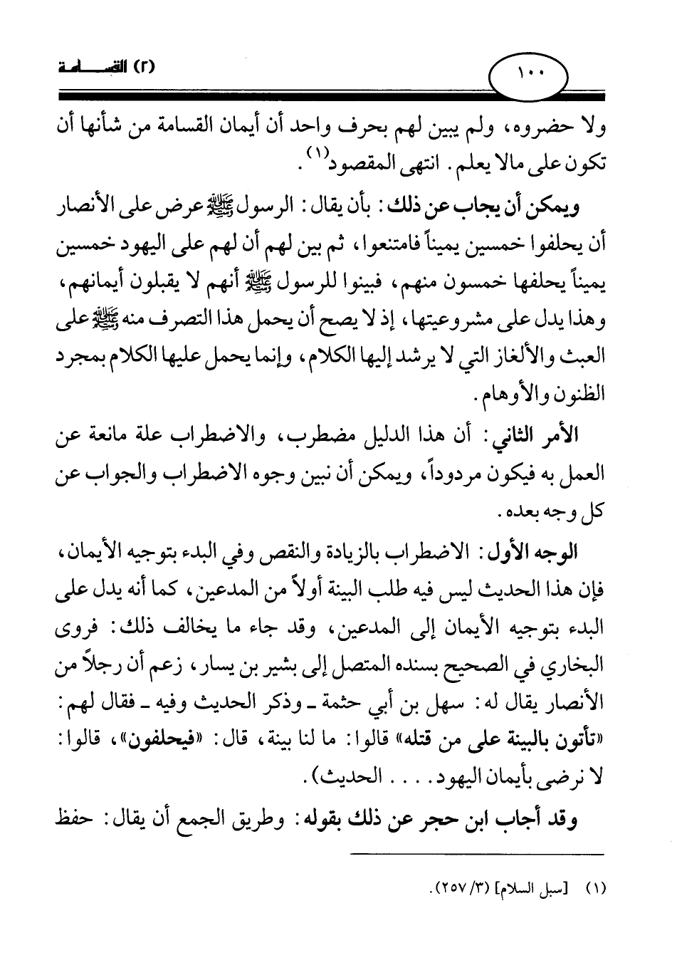 الوجه الأول: الاضطراب بالزيادة والنقص وفي البدء بتوجيه الأيمان، فإن هذا الحديث ليس فيه طلب البينة أولا من المدعين، كما أنه يدل على البدء بتوجيه الأيمان إلى المدعين، وقد جاء ما يخالف ذلك: فروى البخاري في الصحيح بسنده المتصل إلى بشير بن يسار، زعم أن رجلا من الأنصار يقال له: سهل بن أبي حثمة - وذكر الحديث وفيه - فقال لهم: «تأتون بالبينة على من قتله " قالوا: ما لنا بينة، قال: " فيحلفون "، قالوا: لا نرضى بأيمان اليهود (¬2) » . . . . الحديث.