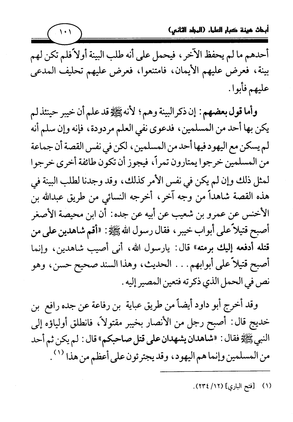 وقد أخرج أبو داود أيضا من طريق عباية بن رفاعة عن جده رافع بن خديج قال: «أصبح رجل من الأنصار بخيبر مقتولا، فانطلق أولياؤه إلى النبي صلى الله عليه وسلم فقال: " شاهدان يشهدان على قتل صاحبكم " قال: لم يكن ثم أحد من المسلمين وإنما هم اليهود، وقد يجترئون على أعظم من هذا (¬2) » .