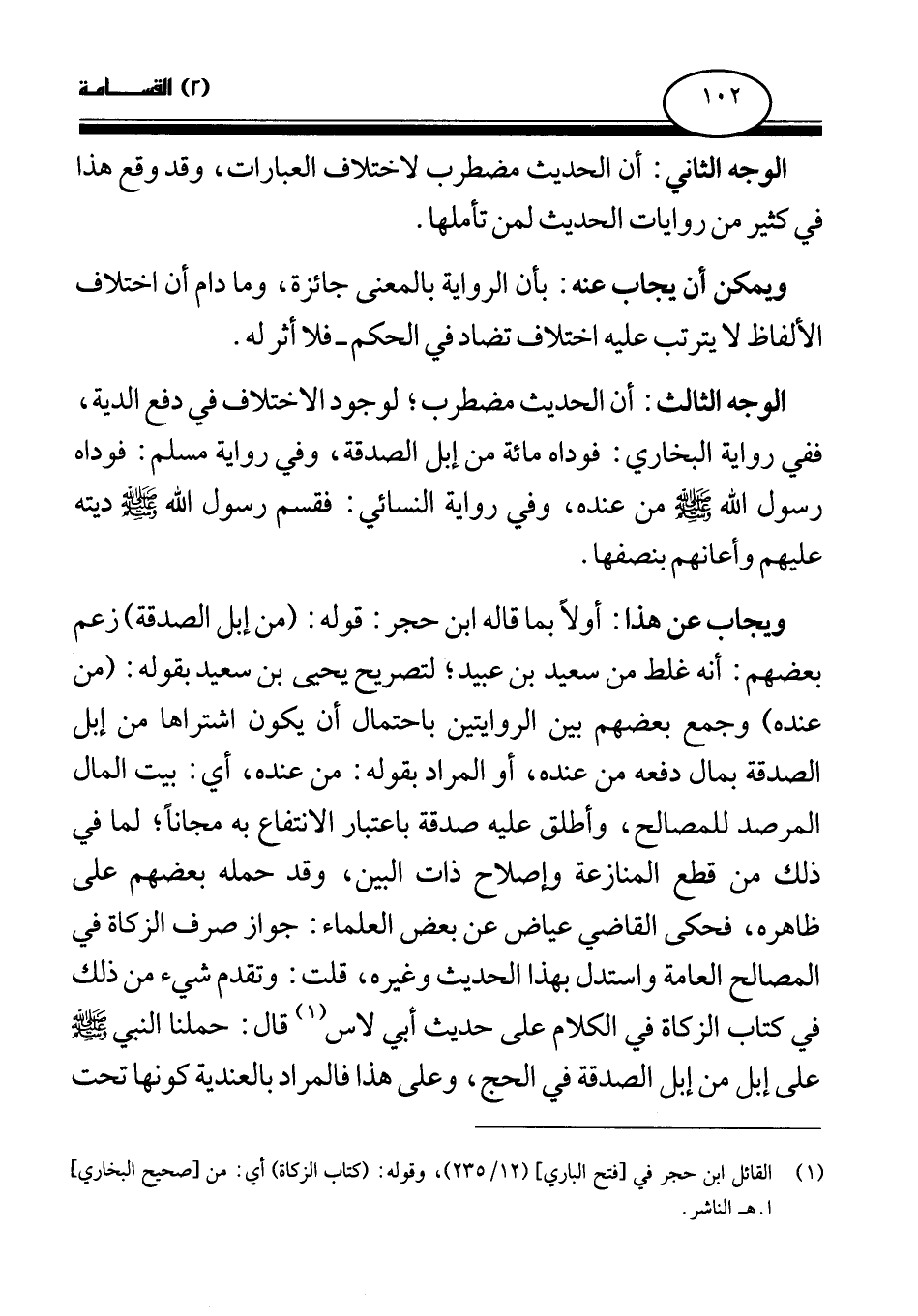 الوجه الثالث: أن الحديث مضطرب؛ لوجود الاختلاف في دفع الدية، ففي رواية البخاري: «فوداه مائة من إبل الصدقة (¬1) » ، وفي رواية مسلم: «فوداه رسول الله صلى الله عليه وسلم من عنده (¬2) » ، وفي رواية النسائي: «فقسم رسول الله صلى الله عليه وسلم ديته عليهم وأعانهم بنصفها (¬3) » .