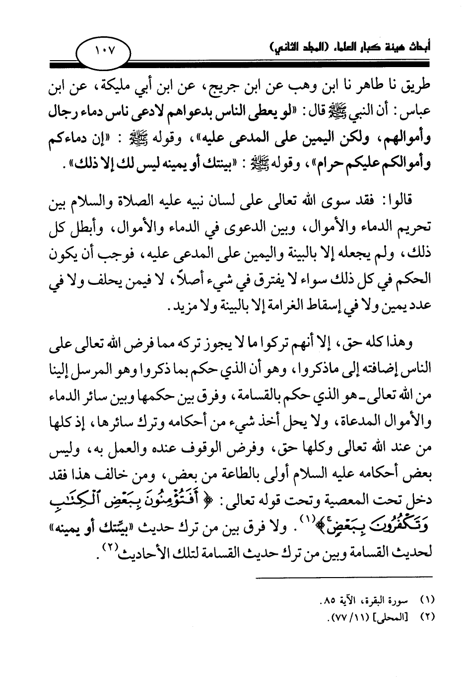 وهذا كله حق، إلا أنهم تركوا ما لا يجوز تركه مما فرض الله تعالى على الناس إضافته إلى ما ذكروا، وهو أن الذي حكم بما ذكروا وهو المرسل إلينا من الله تعالى - هو الذي حكم بالقسامة، وفرق بين حكمها وبين سائر الدماء والأموال المدعاة، ولا يحل أخذ شيء من أحكامه وترك سائرها، إذ كلها من عند الله تعالى وكلها حق، وفرض الوقوف عنده والعمل به، وليس بعض أحكامه علمه السلام أولى بالطاعة من بعض، ومن خالف هذا فقد دخل تحت المعصية وتحت قوله تعالى: {أَفَتُؤْمِنُونَ بِبَعْضِ الْكِتَابِ وَتَكْفُرُونَ بِبَعْضٍ} (¬4) ولا فرق بين من ترك حديث «بينتك أو يمينه (¬5) » لحديث القسامة وبين من ترك حديث القسامة لتلك الأحاديث (¬6) .