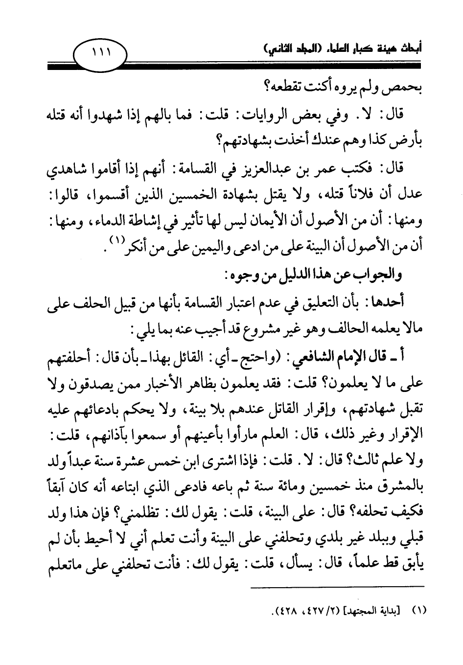 قال: فكتب عمر بن عبد العزيز في القسامة: أنهم إذا أقاموا شاهدي عدل أن فلانا قتله، ولا يقتل بشهادة الخمسين الذين أقسموا، قالوا: ومنها: أن من الأصول أن الأيمان ليس لها تأثير في إشاطة الدماء، ومنها: أن من الأصول أن البينة على من ادعى واليمين على من أنكر (¬1) .