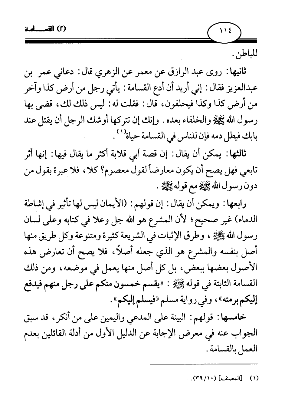 ثانيها: روى عبد الرزاق عن معمر عن الزهري قال: دعاني عمر بن عبد العزيز فقال: إني أريد أن أدع القسامة: يأتي رجل من أرض كذا وآخر من أرض كذا وكذا فيحلفون، قال: فقلت له: ليس ذلك لك، قضى بها رسول الله صلى الله عليه وسلم والخلفاء بعده. وإنك إن تتركها أوشك الرجل أن يقتل عند بابك فيطل دمه فإن للناس في القسامة حياة (¬1) .
