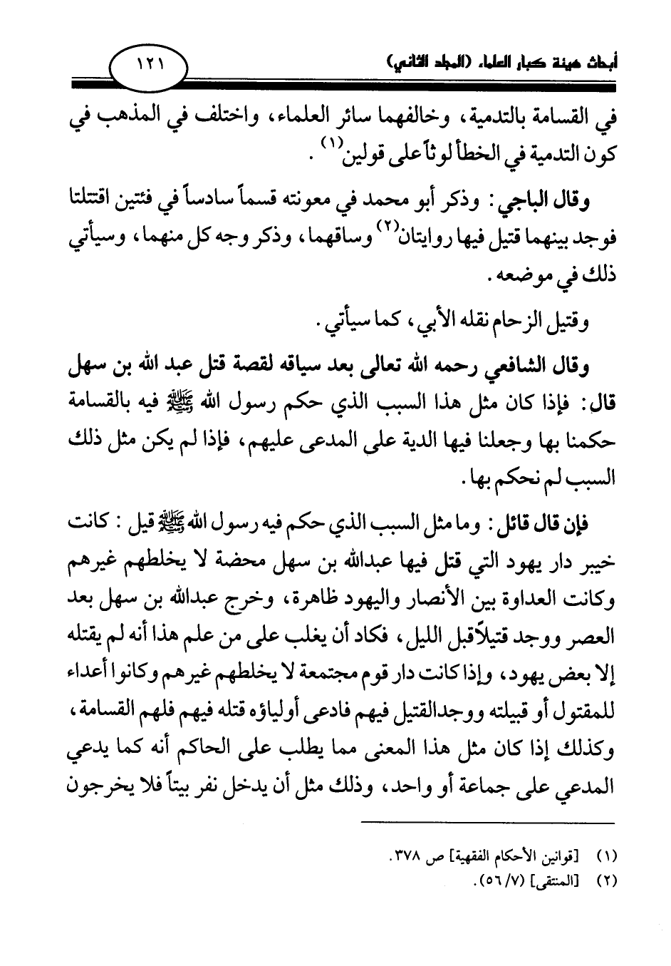 وقال الشافعي رحمه الله تعالى بعد سياقه لقصة قتل عبد الله بن سهل قال: فإذا كان مثل هذا السبب الذي حكم رسول الله صلى الله عليه وسلم فيه بالقسامة حكمنا بها وجعلنا فيها الدية على المدعى عليهم، فإذا لم يكن مثل ذلك السبب لم نحكم بها.