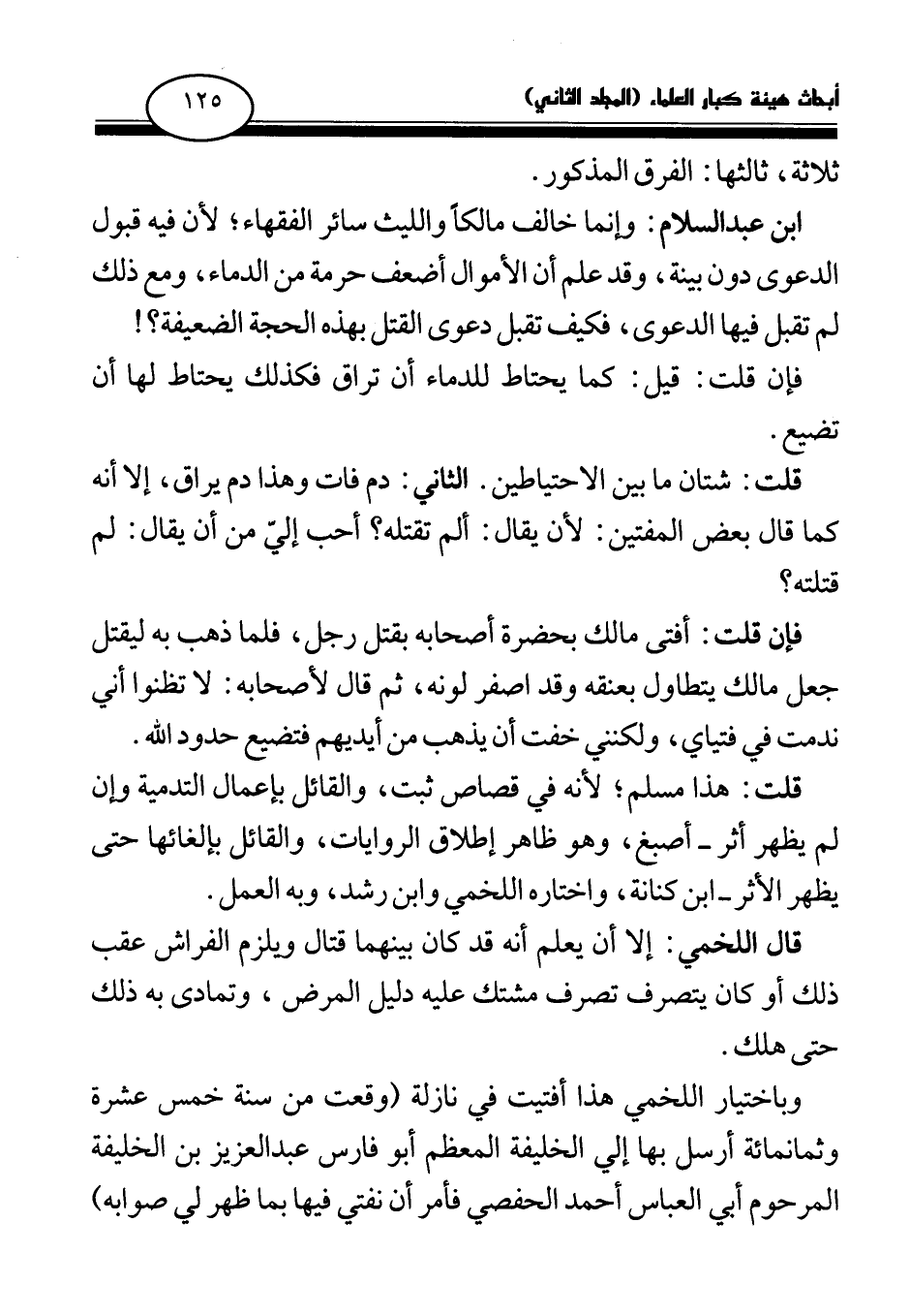 ابن عبد السلام: وإنما خالف مالكا والليث سائر الفقهاء؛ لأن فيه قبول الدعوى دون بينة، وقد علم أن الأموال أضعف حرمة من الدماء، ومع ذلك لم تقبل فيها الدعوى، فكيف تقبل دعوى القتل بهذه الحجة الضعيفة؟ !