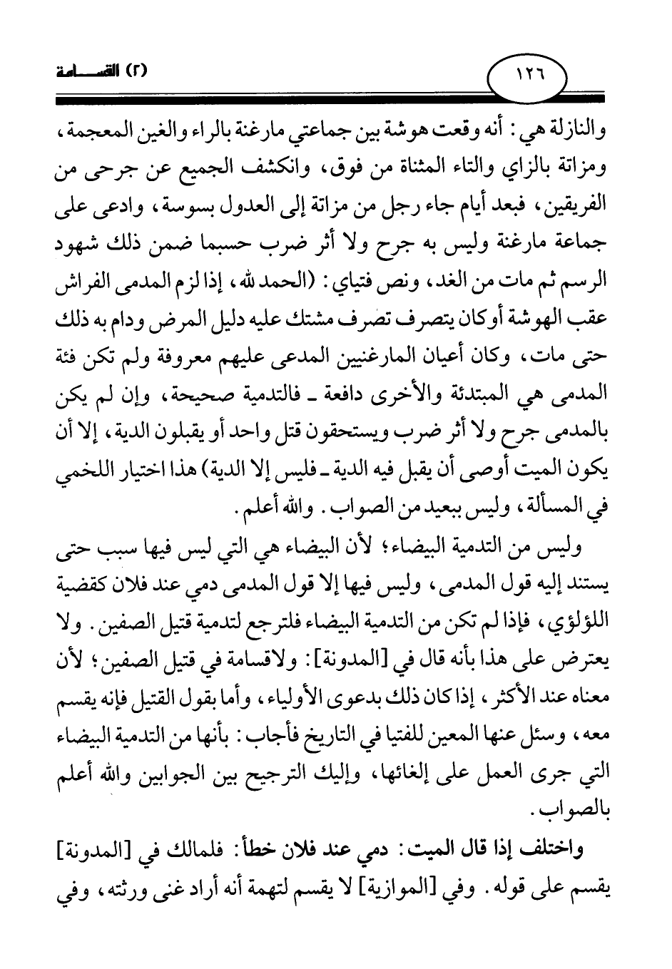 والنازلة هي: أنه وقعت هوشة بين جماعتي مارغنة بالراء والغين المعجمة، ومزاتة بالزاي والتاء المثناة من فوق، وانكشف الجميع عن جرحى من الفريقين، فبعد أيام جاء رجل من مزاتة إلى العدول بسوسة، وادعى على جماعة مارغنة وليس به جرح ولا أثر ضرب حسبما ضمن ذلك شهود الرسم ثم مات من الغد، ونص فتياي: (الحمد لله، إذا لزم المدمى الفراش عقب الهوشة أو كان يتصرف تصرف مشتك عليه دليل المرض ودام به ذلك حتى مات، وكان أعيان المارغنيين المدعى عليهم معروفة ولم تكن فئة المدمى هي المبتدئة والأخرى دافعة - فالتدمية صحيحة، وإن لم يكن بالمدمى جرح ولا أثر ضرب ويستحقون قتل واحد أو يقبلون الدية، إلا أن يكون الميت أوصى أن يقبل فيه [الدية] فليس إلا الدية) هذا اختيار اللخمي في المسألة، وليس ببعيد من الصواب. والله أعلم.