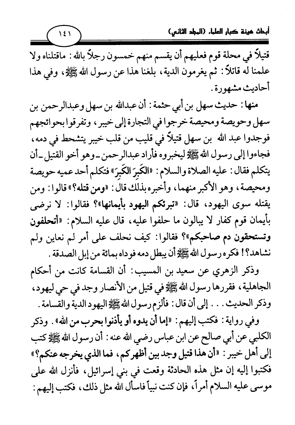 منها: حديث سهل بن أبي حثمة: «أن عبد الله بن سهل وعبد الرحمن بن سهل وحويصة ومحيصة خرجوا في التجارة إلى خيبر، وتفرقوا بحوائجهم فوجدوا عبد الله بن سهل قتيلا في قليب من قلب خيبر يتشحط في دمه، فجاءوا إلى رسول الله صلى الله عليه وسلم ليخبروه فأراد عبد الرحمن - وهو أخو القتيل- أن يتكلم فقال: عليه الصلاة والسلام: الكبر الكبر، فتكلم أحد عميه حويصة ومحيصة، وهو الأكبر منهما، وأخبره بذلك قال: ومن قتله؟ قالوا: ومن يقتله سوى اليهود، قال: تبرئكم اليهود بأيمانها؟ فقالوا: لا نرضى بأيمان قوم كفار لا يبالون ما حلفوا عليه، قال عليه السلام: أتحلفون وتستحقون دم صاحبكم؟ فقالوا: كيف نحلف على أمر لم نعاين ولم نشاهد؟! فكره رسول الله صلى الله عليه وسلم أن يبطل دمه فوداه بمائة من إبل الصدقة (¬1) » .