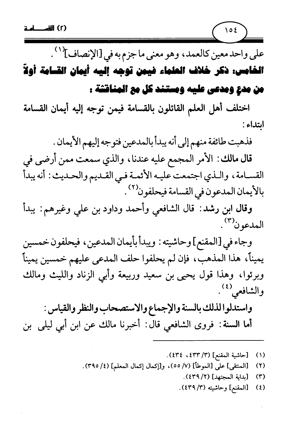 وجاء في [المقنع] وحاشيته: ويبدأ بأيمان المدعين، فيحلفون خمسين يمينا، هذا المذهب، فإن لم يحلفوا حلف المدعى عليهم خمسين يمينا وبرئوا، وهذا قول يحيى بن سعيد وربيعة وأبى الزناد والليث ومالك والشافعي (¬3) .