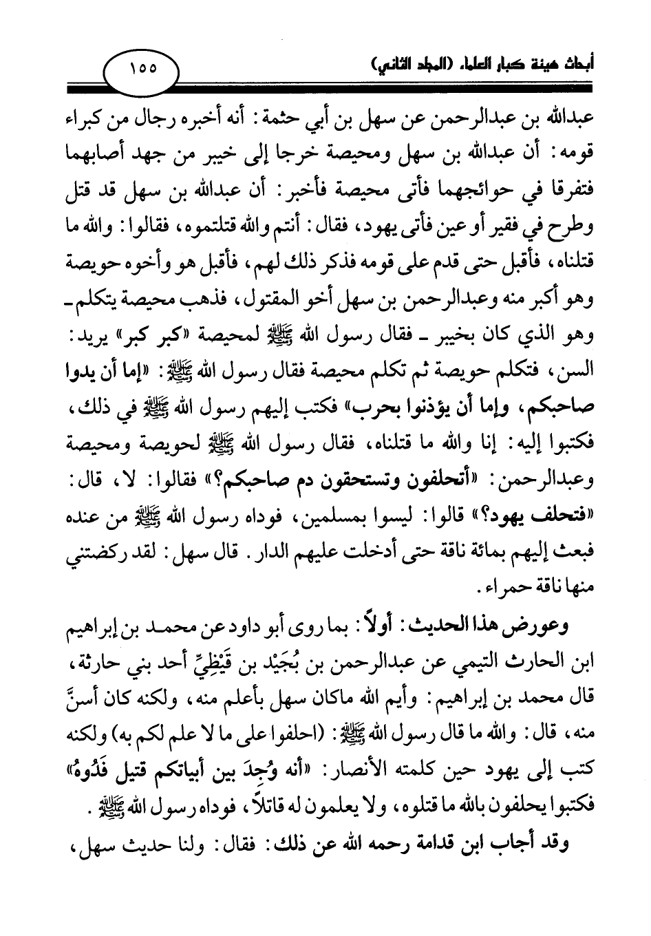 ابن أبي ليلى بن عبد الله بن عبد الرحمن عن سهل بن أبي حثمة: أنه أخبره رجال من كبراء قومه: «أن عبد الله بن سهل ومحيصة خرجا إلى خيبر من جهد أصابهما فتفرقا في حوائجهما فأتى محيصة فأخبر: أن عبد الله بن سهل قد قتل وطرح في فقير أو عين فأتى يهود، فقال: أنتم والله قتلتموه، فقالوا: والله ما قتلناه، فأقبل حتى قدم على قومه فذكر ذلك لهم، فأقبل هو وأخوه حويصة وهو أكبر منه وعبد الرحمن بن سهل أخو المقتول، فذهب محيصة يتكلم- وهو الذي كان بخيبر - فقال رسول الله صلى الله عليه وسلم لمحيصة كبر كبر يريد: السن، فتكلم حويصة ثم تكلم محيصة فقال رسول الله صلى الله عليه وسلم: إما أن يدوا صاحبكم، وإما أن يؤذنوا بحرب، فكتب إليهم رسول الله صلى الله عليه وسلم في ذلك، فكتبوا إليه: إنا والله ما قتلناه، فقال رسول الله صلى الله عليه وسلم لحويصة ومحيصة وعبد الرحمن: أتحلفون وتستحقون دم صاحبكم؟ فقالوا: لا، قال: فتحلف يهود؟ قالوا: ليسوا بمسلمين، فوداه رسول الله صلى الله عليه وسلم من عنده فبعث إليهم بمائة ناقة حتى أدخلت عليهم الدار. قال سهل: لقد ركضتني منها ناقة حمراء (¬1) » .