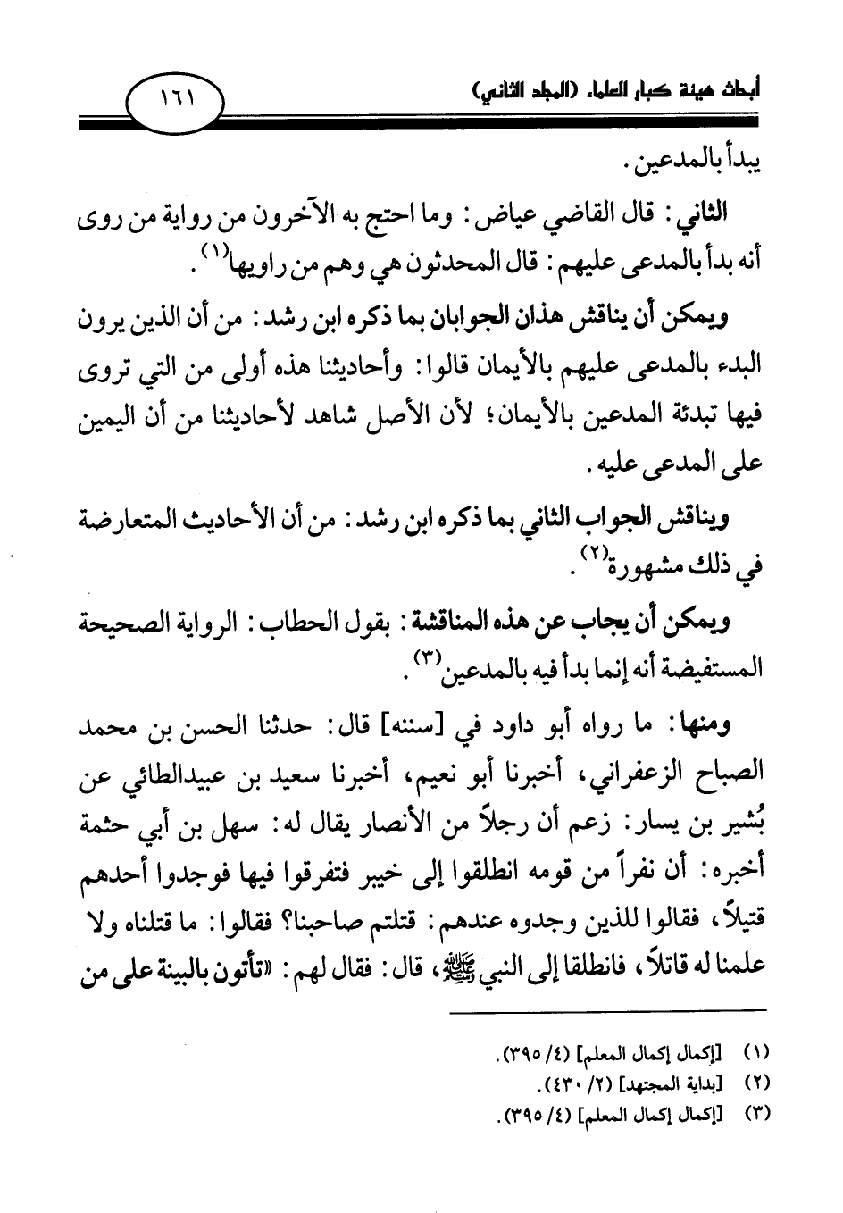 الثاني: قال القاضي عياض: وما احتج به الآخرون من رواية من روى أنه بدأ بالمدعى عليهم: قال المحدثون هي وهم من راويها (¬1) .