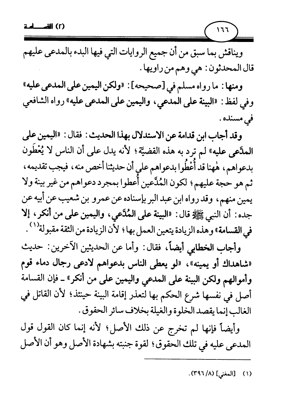 وقد أجاب ابن قدامة عن الاستدلال بهذا الحديث: فقال: اليمين على المدعى عليه لم ترد به هذه القضية؛ لأنه يدل على أن الناس لا يعطون بدعواهم، هاهنا قد أعطوا بدعواهم على أن حديثنا أخص منه، فيجب تقديمه، ثم هو حجة عليهم؛ لكون المدعين أعطوا بمجرد دعواهم من غير بينة ولا يمين منهم، وقد رواه ابن عبد البر بإسناده عن عمرو بن شعيب عن أبيه عن جده: أن النبي صلى الله عليه وسلم قال: «البينة على المدعي، واليمين على من أنكر، إلا في القسامة» وهذه الزيادة يتعين العمل بها؛ لأن الزيادة من الثقة مقبولة (¬3) . وأجاب الخطابي أيضا، فقال: وأما عن الحديثين الآخرين: حديث «شاهداك أو يمينه (¬4) » ، «لو يعطى الناس بدعواهم لادعى رجال دماء قوم وأموالهم ولكن البينة على المدعي واليمين على من أنكر (¬5) » - فإن القسامة أصل في نفسها شرع الحكم بها لتعذر إقامة البينة حينئذ؛ لأن القاتل في الغالب إنما يقصد الخلوة والغيلة بخلاف سائر الحقوق.