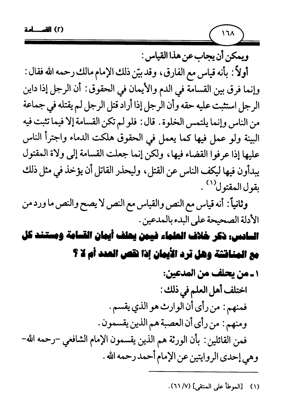 أولا: بأنه قياس مع الفارق، وقد بين ذلك الإمام مالك رحمه الله فقال: وإنما فرق بين القسامة في الدم والأيمان في الحقوق: أن الرجل إذا داين الرجل استثبت عليه حقه وأن الرجل إذا أراد قتل الرجل لم يقتله في جماعة من الناس وإنما يلتمس الخلوة. قال: فلو لم تكن القسامة إلا فيما تثبت فيه البينة ولو عمل فيها كما يعمل في الحقوق هلكت الدماء واجترأ الناس عليها إذا عرفوا القضاء فيها، ولكن إنما جعلت القسامة إلى ولاة المقتول يبدءون فيها ليكف الناس عن القتل، وليحذر القاتل أن يؤخذ في مثل ذلك بقول المقتول (¬1) .