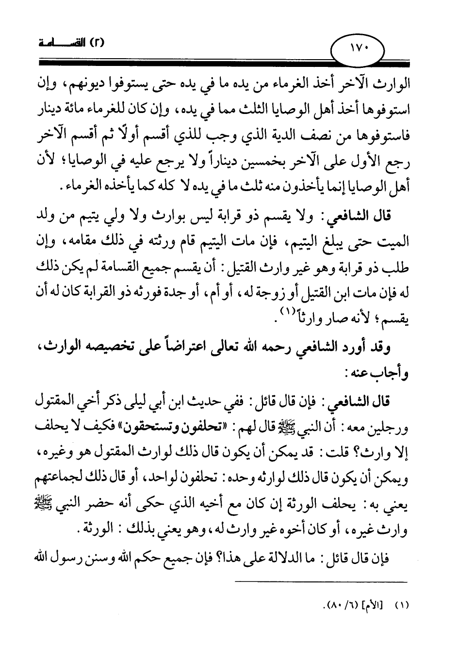 قال الشافعي: فإن قال قائل: ففي حديث ابن أبي ليلى ذكر أخي المقتول ورجلين معه: أن النبي صلى الله عليه وسلم قال لهم: تحلفون وتستحقون فكيف لا يحلف إلا وارث؟ قلت: قد يمكن أن يكون قال ذلك لوارث المقتول هو وغيره، ويمكن أن يكون قال ذلك لوارثه وحده: تحلفون لواحد، أو قال ذلك لجماعتهم يعني به: يحلف الورثة أن كان مع أخيه الذي حكى أنه حضر النبي صلى الله عليه وسلم وارث غيره، أو كان أخوه غير وارث له، وهو يعني بذلك: الورثة.