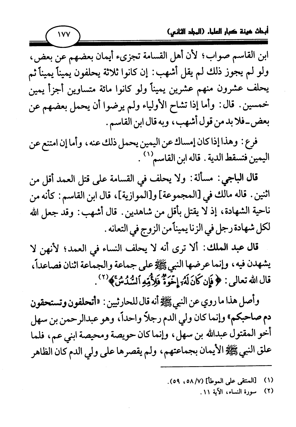 قال عبد الملك: ألا ترى أنه لا يحلف النساء في العمد؛ لأنهن لا يشهدن فيه، وإنما عرضها النبي صلى الله عليه وسلم على جماعة والجماعة اثنان فصاعدا، قال الله تعالى: {فَإِنْ كَانَ لَهُ إِخْوَةٌ فَلِأُمِّهِ السُّدُسُ} (¬2)