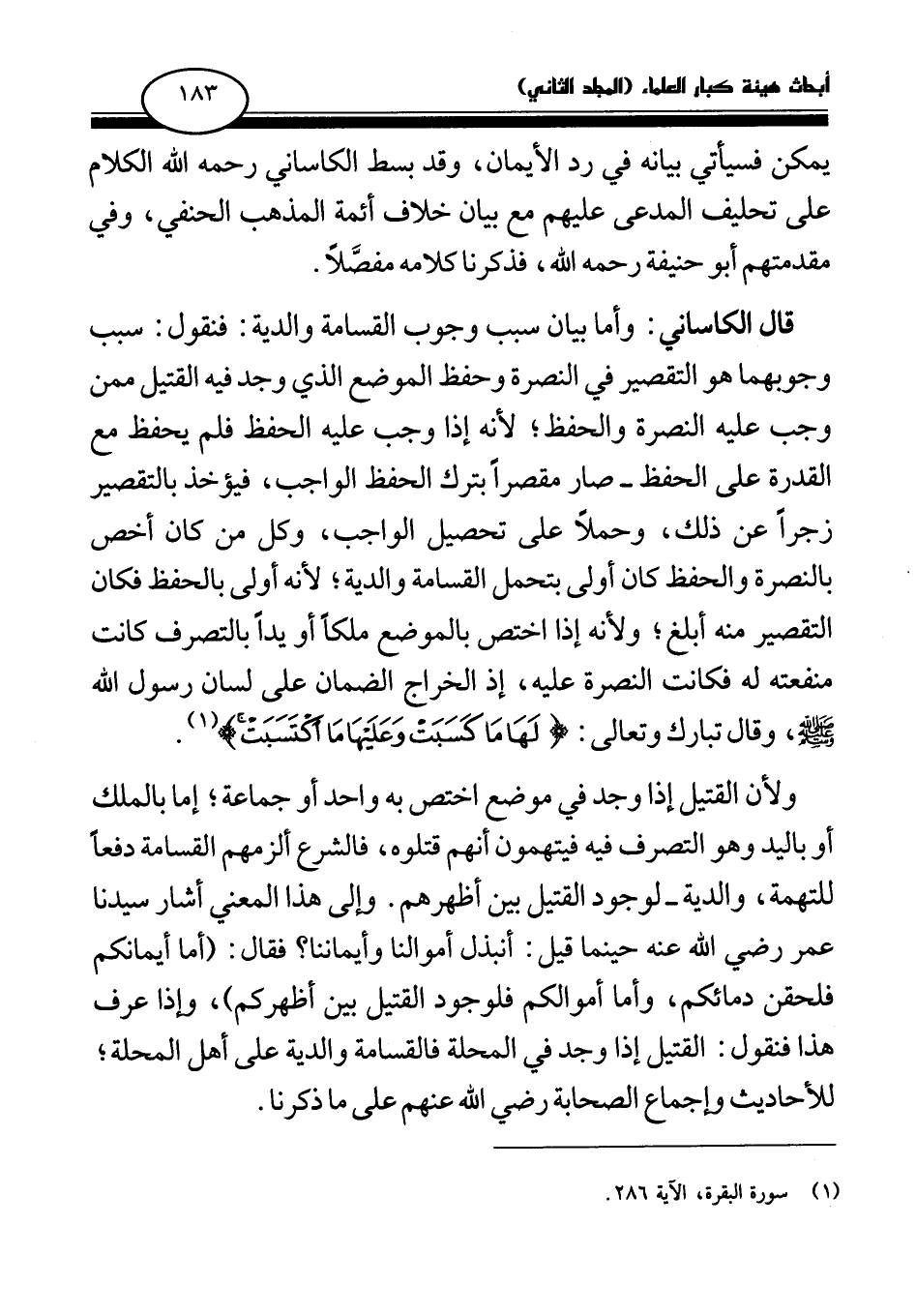 قال الكاساني: وأما بيان سبب وجوب القسامة والدية: فنقول: سبب وجوبهما هو التقصير في النصرة وحفظ الموضع الذي وجد فيه القتيل ممن وجب عليه النصرة والحفظ؛ لأنه إذا وجب عليه الحفظ فلم يحفظ مع القدرة على الحفظ- صار مقصرا بترك الحفظ الواجب، فيؤخذ بالتقصير زجرا عن ذلك، وحملا على تحصيل الواجب، وكل من كان أخص بالنصرة والحفظ كان أولى بتحمل القسامة والدية؛ لأنه أولى بالحفظ فكان التقصير منه أبلغ، ولأنه إذا اختص بالموضع ملكا أو يدا بالتصرف كانت منفعته له فكانت النصرة عليه، إذ الخراج الضمان على لسان رسول الله صلى الله عليه وسلم، وقال تبارك وتعالى: {لَهَا مَا كَسَبَتْ وَعَلَيْهَا مَا اكْتَسَبَتْ} (¬1)
