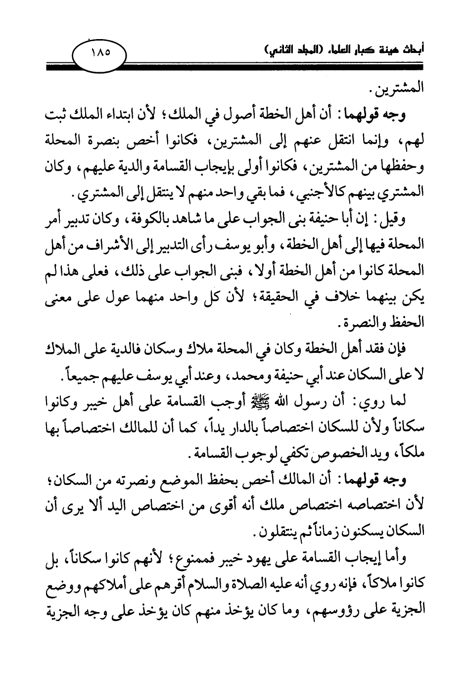 وقيل: إن أبا حنيفة بنى الجواب على ما شاهد بالكوفة، وكان تدبير أمر المحلة فيها إلى أهل الخطة، وأبو يوسف رأى التدبير إلى الأشراف من أهل المحلة كانوا من أهل الخطة أو لا، فبنى الجواب على ذلك، فعلى هذا لم يكن بينهما خلاف في الحقيقة؛ لأن كل واحد منهما عول على معنى الحفظ والنصرة.