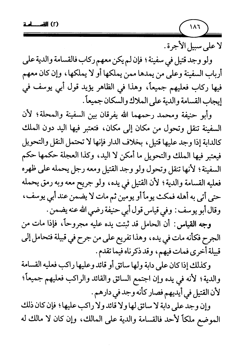 ولو وجد قتيل في سفينة؛ فإن لم يكن معهم ركاب فالقسامة والدية على أرباب السفينة وعلى من يمدها ممن يملكها أو لا يملكها، وإن كان معهم فيها ركاب فعليهم جميعا، وهذا في الظاهر يؤيد قول أبي يوسف في إيجاب القسامة والدية على الملاك والسكان جميعا.