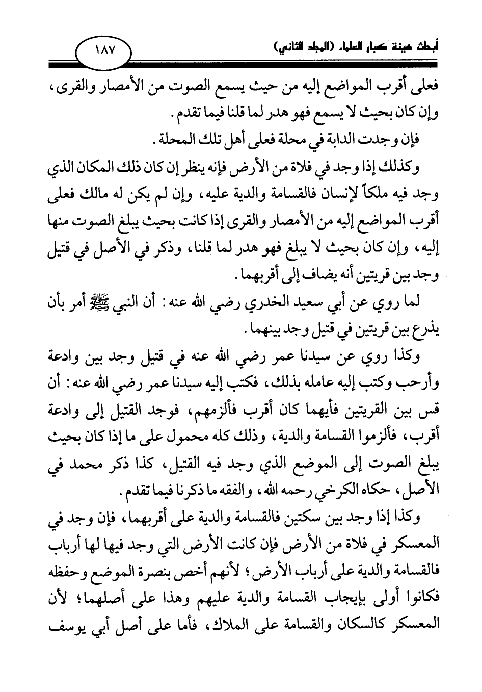 وكذا روي عن سيدنا عمر رضي الله عنه في قتيل وجد بين وادعة وأرحب وكتب إليه عامله بذلك، فكتب إليه سيدنا عمر رضي الله عنه: أن قس بين القريتين فأيهما كان أقرب فألزمهم، فوجد القتيل إلى وادعة أقرب، فألزموا القسامة والدية، وذلك كله محمول على ما إذا كان بحيث يبلغ الصوت إلى الموضع الذي وجد فيه القتيل، كذا ذكر محمد في الأصل، حكاه الكرخي رحمه الله، والفقه ما ذكرنا فيما تقدم.