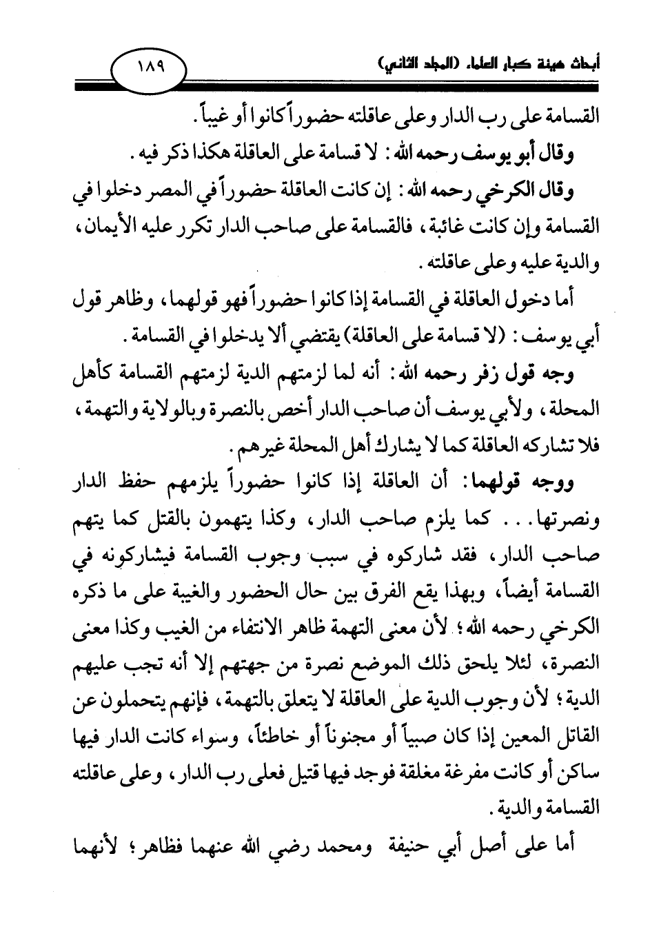 ووجه قولهما: أن العاقلة إذا كانوا حضورا يلزمهم حفظ الدار ونصرتها. . . كما يلزم صاحب الدار، وكذا يتهمون بالقتل كما يتهم صاحب الدار، فقد شاركوه في سبب وجوب القسامة فيشاركونه في القسامة أيضا، وبهذا يقع الفرق بين حال الحضور والغيبة على ما ذكره الكرخي رحمه الله؛ لأن معنى التهمة ظاهر الانتفاء من الغيب وكذا معنى النصرة، لئلا يلحق ذلك الموضع نصرة من جهتهم إلا أنه تجب عليهم الدية؛ لأن وجوب الدية على العاقلة لا يتعلق بالتهمة، فإنهم يتحملون عن القاتل المعين إذا كان صبيا أو مجنونا أو خاطئا، وسواء كانت الدار فيها ساكن أو كانت مفرغة مغلقة فوجد فيها قتيل فعلى رب الدار، وعلى عاقلته القسامة والدية.