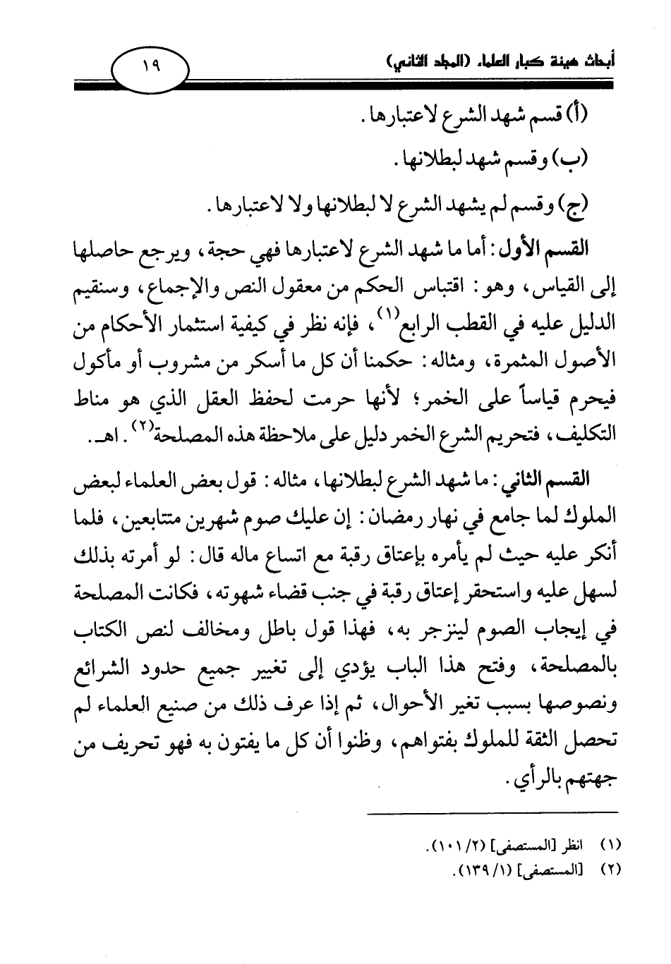 القسم الثاني: ما شهد الشرع لبطلانها، مثاله: قول بعض العلماء لبعض الملوك لما جامع في نهار رمضان: إن عليك صوم شهرين متتابعين، فلما أنكر عليه حيث لم يأمره بإعتاق رقبة مع اتساع ماله قال: لو أمرته بذلك لسهل عليه واستحقر إعتاق رقبة في جنب قضاء شهوته، فكانت المصلحة في إيجاب الصوم لينزجر به، فهذا قول باطل ومخالف لنص الكتاب بالمصلحة، وفتح هذا الباب يؤدي إلى تغيير جميع حدود الشرائع ونصوصها بسبب تغير الأحوال، ثم إذا عرف ذلك من صنيع العلماء لم تحصل الثقة للملوك بفتواهم، وظنوا أن كل ما يفتون به فهو تحريف من جهتهم بالرأي.