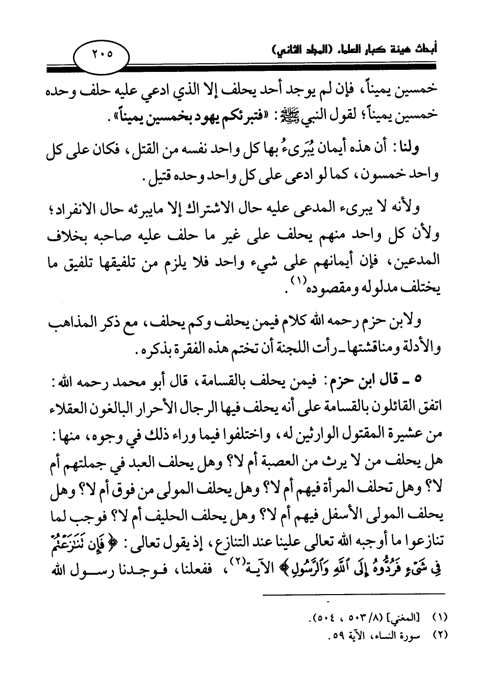 5 - قال ابن حزم: فيمن يحلف بالقسامة، قال أبو محمد رحمه الله: اتفق القائلون بالقسامة على أنه يحلف فيها الرجال الأحرار البالغون العقلاء من عشيرة المقتول الوارثين له، واختلفوا فيما وراء ذلك في وجوه، منها: هل يحلف من لا يرث من العصبة أم لا؟ وهل يحلف العبد في جملتهم أم لا؟ وهل تحلف المرأة فيهم أم لا؟ وهل يحلف المولى من فوق أم لا؟ وهل يحلف المولى الأسفل فيهم أم لا؟ وهل يحلف الحليف أم لا؟ فوجب لما تنازعوا ما أوجبه الله تعالى علينا عند التنازع، إذ يقول تعالى: {فَإِنْ تَنَازَعْتُمْ فِي شَيْءٍ فَرُدُّوهُ إِلَى اللَّهِ وَالرَّسُولِ} (¬3) ففعلنا، فوجدنا رسول الله