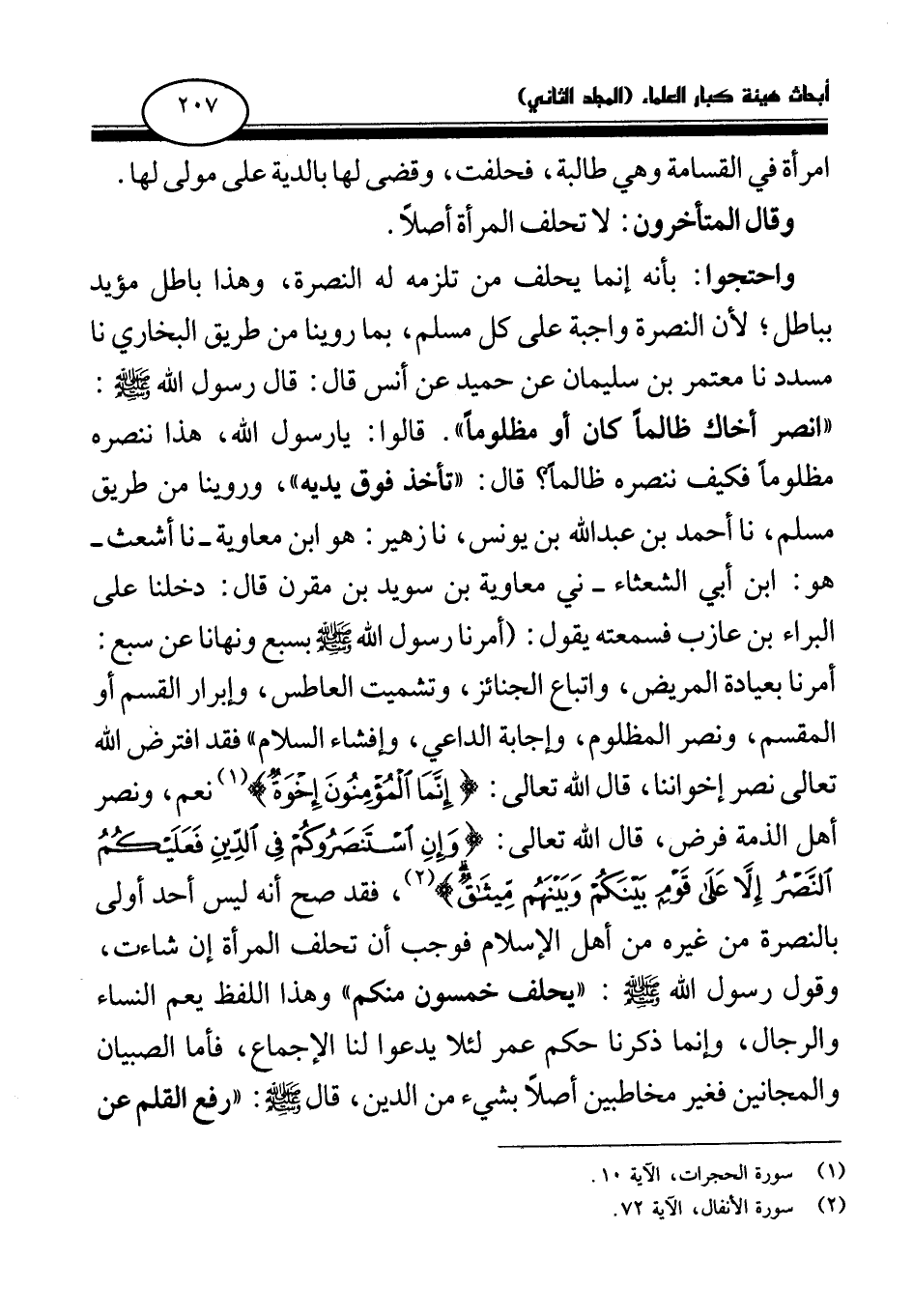 واحتجوا: بأنه إنما يحلف من تلزمه له النصرة، وهذا باطل مؤيد بباطل؛ لأن النصرة واجبة على كل مسلم، بما روينا من طريق البخاري نا مسدد نا معتمر بن سليمان عن حميد عن أنس قال: قال رسول الله صلى الله عليه وسلم: «انصر أخاك ظالما كان أو مظلوما. قالوا: يا رسول الله، هذا ننصره مظلوما فكيف ننصره ظالما؟ قال: تأخذ فوق يديه (¬1) » ، وروينا من طريق مسلم، نا أحمد بن عبد الله بن يونس، نا زهير: هو ابن معاوية -نا أشعث - هو: ابن أبي الشعثاء - ني معاوية بن سويد بن مقرن قال: دخلنا على البراء بن عازب فسمعته يقول: «أمرنا رسول الله صلى الله عليه وسلم بسبع ونهانا عن سبع: أمرنا بعيادة المريض، واتباع الجنائز، وتشميت العاطس، وإبرار القسم أو المقسم، ونصر المظلوم، وإجابة الداعي، وإفشاء السلام (¬2) » فقد افترض الله تعالى نصر إخواننا، قال الله تعالى: {إِنَّمَا الْمُؤْمِنُونَ إِخْوَةٌ} (¬3) نعم، ونصر أهل الذمة فرض، قال الله تعالى: {وَإِنِ اسْتَنْصَرُوكُمْ فِي الدِّينِ فَعَلَيْكُمُ النَّصْرُ إِلَّا عَلَى قَوْمٍ بَيْنَكُمْ وَبَيْنَهُمْ مِيثَاقٌ} (¬4) فقد صح أنه ليس أحد أولى بالنصرة من غيره من أهل الإسلام، فوجب أن تحلف المرأة إن شاءت، وقول رسول الله صلى الله عليه وسلم: «يحلف خمسون منكم (¬5) » وهذا اللفظ يعم النساء والرجال، وإنما ذكرنا حكم عمر لئلا يدعوا لنا الإجماع، فأما الصبيان والمجانين فغير مخاطبين أصلا بشيء من الدين، قال صلى الله عليه وسلم: «رفع القلم عن
