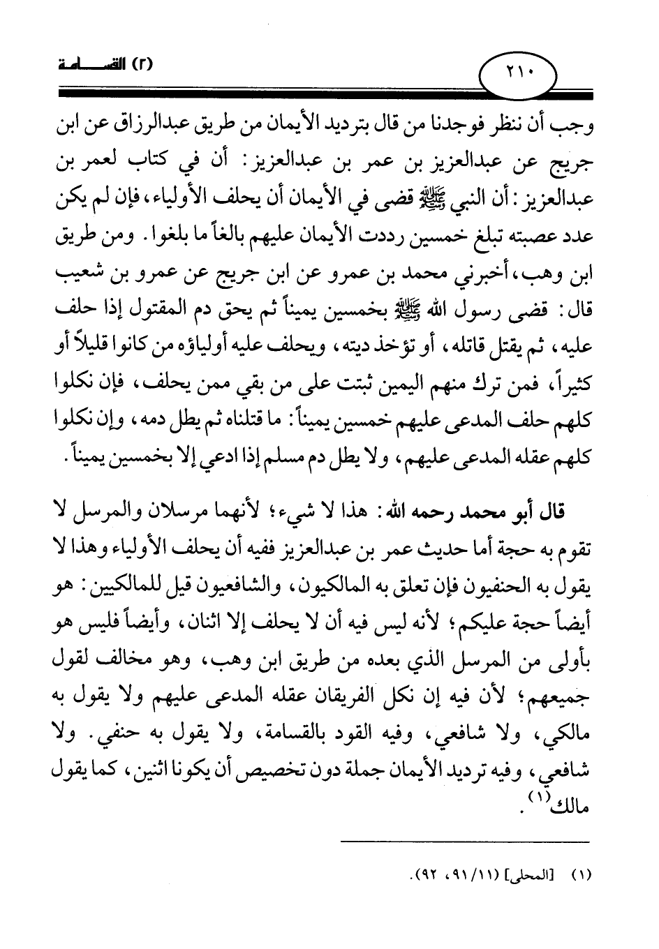 وجب أن ننظر فوجدنا من قال بترديد الأيمان من طريق عبد الرزاق عن ابن جريج عن عبد العزيز بن عمر بن عبد العزيز: أن في كتاب لعمر بن عبد العزيز: «أن النبي صلى الله عليه وسلم قضى في الأيمان أن يحلف الأولياء، فإن لم يكن عدد عصبته تبلغ خمسين رددت الأيمان عليهم بالغا ما بلغوا» .