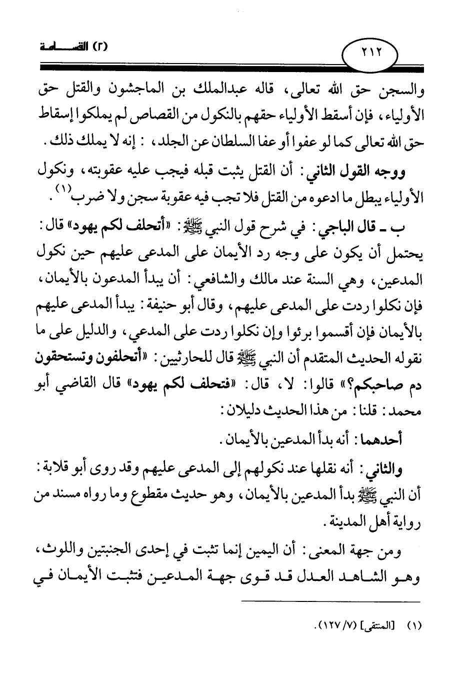 ب- قال الباجي: في شرح قول النبي صلى الله عليه وسلم: «أتحلف لكم يهود (¬2) » قال: يحتمل أن يكون على وجه رد الأيمان على المدعى عليهم حين نكول المدعين، وهي السنة عند مالك والشافعي: أن يبدأ المدعون بالأيمان، فإن نكلوا ردت على المدعى عليهم، وقال أبو حنيفة: يبدأ المدعى عليهم بالأيمان فإن أقسموا برئوا وإن نكلوا ردت على المدعي، والدليل على ما نقوله الحديث المتقدم أن النبي صلى الله عليه وسلم قال للحارثيين: «أتحلفون وتستحقون دم صاحبكم؟ قالوا: لا، قال: فتحلف لكم يهود (¬3) » قال القاضي أبو محمد: قلنا: من هذا الحديث دليلان: