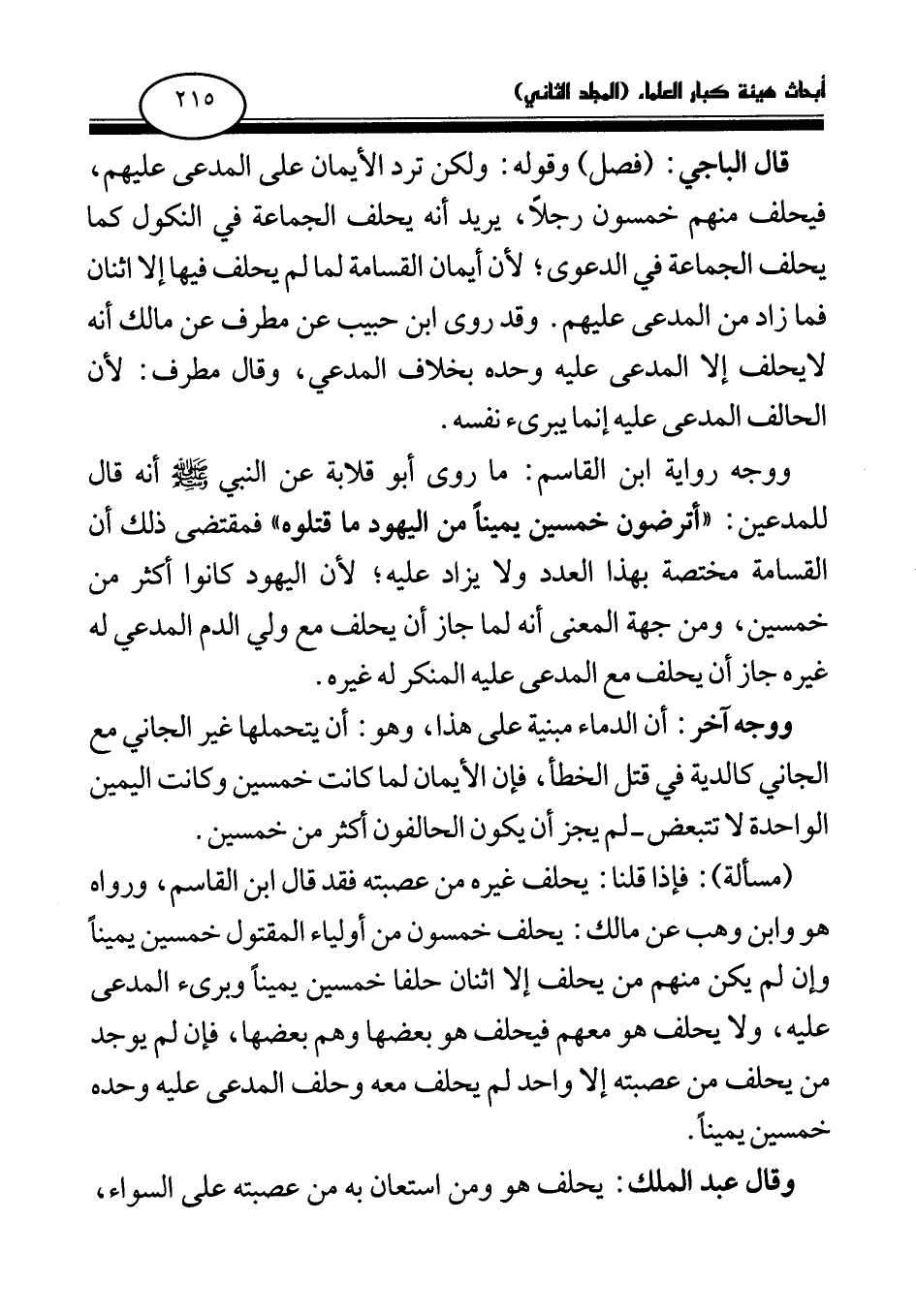ووجه رواية ابن القاسم: ما روى أبو قلابة عن النبي صلى الله عليه وسلم أنه قال للمدعين: «أترضون خمسين يمينا من اليهود ما قتلوه (¬1) » فمقتضى ذلك أن القسامة مختصة بهذا العدد ولا يزاد عليه؛ لأن اليهود كانوا أكثر من خمسين، ومن جهة المعنى أنه لما جاز أن يحلف مع ولي الدم المدعي له غيره جاز أن يحلف مع المدعى عليه المنكر له غيره.