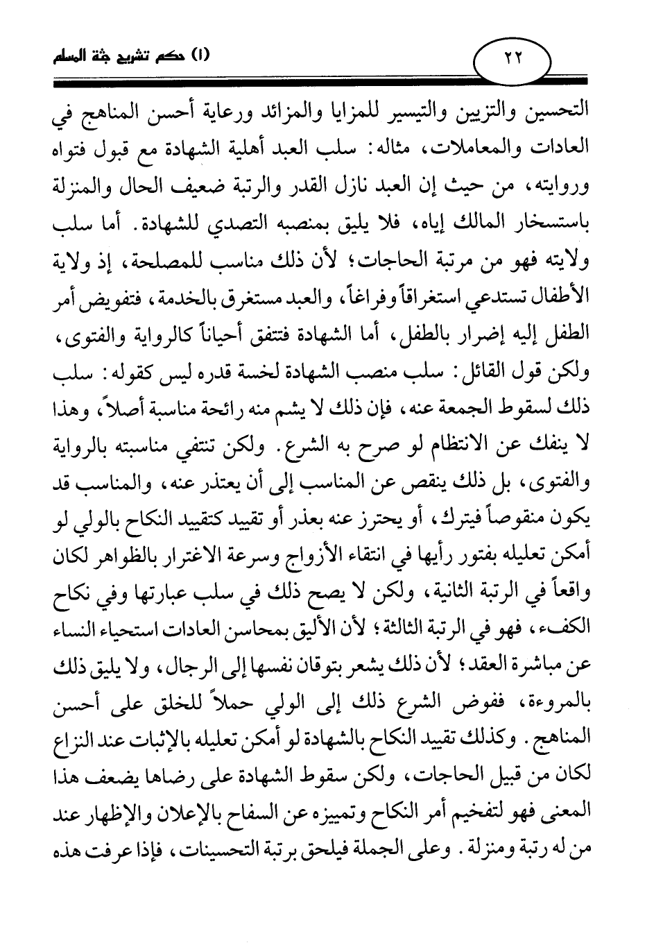 وكذلك تقييد النكاح بالشهادة لو أمكن تعليله بالإثبات عند النزاع لكان من قبيل الحاجات، ولكن سقوط الشهادة على رضاها يضعف هذا المعنى فهو لتفخيم أمر النكاح وتمييزه عن السفاح بالإعلان والإظهار عند من له رتبة ومنزلة. وعلى الجملة فيلحق برتبة التحسينات، فإذا عرفت هذه