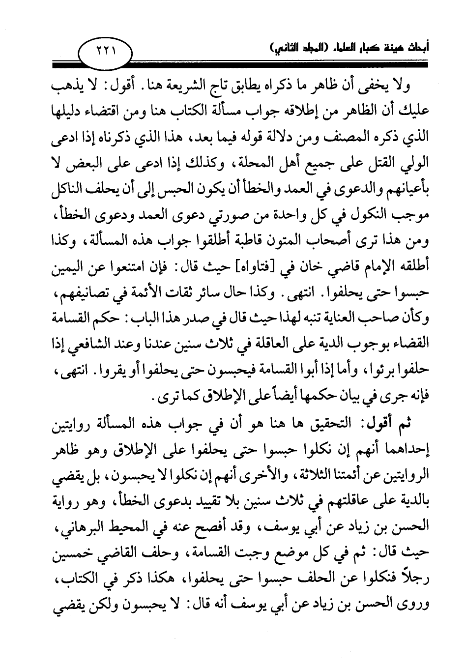 ثم أقول: التحقيق هاهنا هو أن في جواب هذه المسألة روايتين إحداهما أنهم إن نكلوا حبسوا حتى يحلفوا على الإطلاق وهو ظاهر الروايتين عن أئمتنا الثلاثة، والأخرى أنهم إن نكلوا لا يحبسون، بل يقضي بالدية على عاقلتهم في ثلاث سنين بلا تقييد بدعوى الخطأ، وهو رواية الحسن بن زياد عن أبي يوسف، وقد أفصح عنه في المحيط البرهاني، حيث قال: ثم في كل موضع وجبت القسامة، وحلف القاضي خمسين رجلا فنكلوا عن الحلف حبسوا حتى يحلفوا، هكذا ذكر في الكتاب، وروى الحسن بن زياد عن أبي يوسف أنه قال: لا يحبسون ولكن يقضي