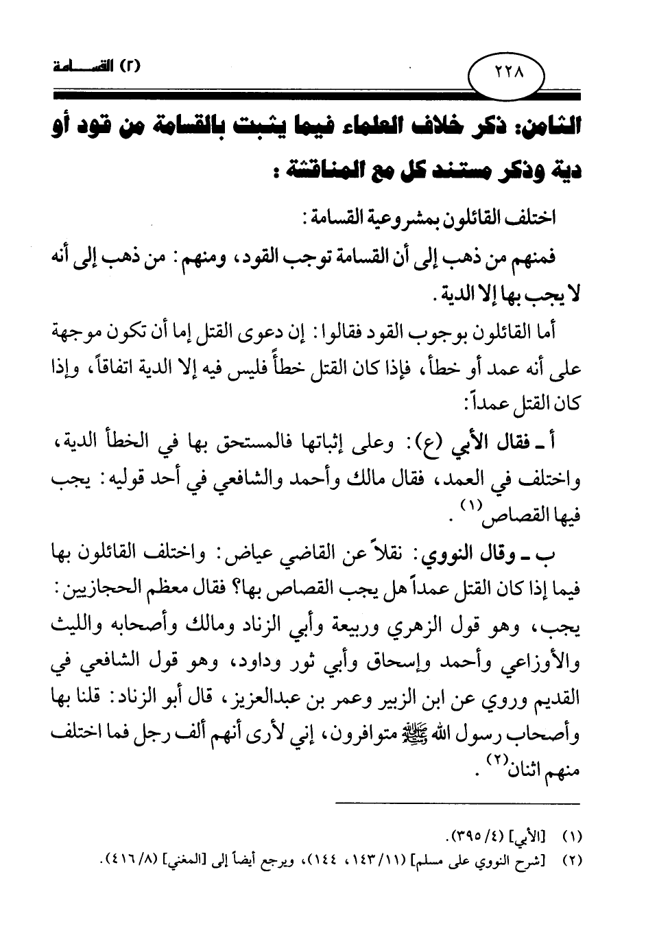 ب- وقال النووي: نقلا عن القاضي عياض: واختلف القائلون بها فيما إذا كان القتل عمدا هل يجب القصاص بها؟ فقال معظم الحجازيين: يجب، وهو قول الزهري وربيعة وأبي الزناد ومالك وأصحابه والليث والأوزاعي وأحمد وإسحاق وأبي ثور وداود، وهو قول الشافعي في القديم وروي عن ابن الزبير وعمر بن عبد العزيز، قال أبو الزناد: قلنا بها وأصحاب رسول الله - صلى الله عليه وسلم - متوافرون، إني لأرى أنهم ألف رجل فما اختلف منهم اثنان (¬2) .