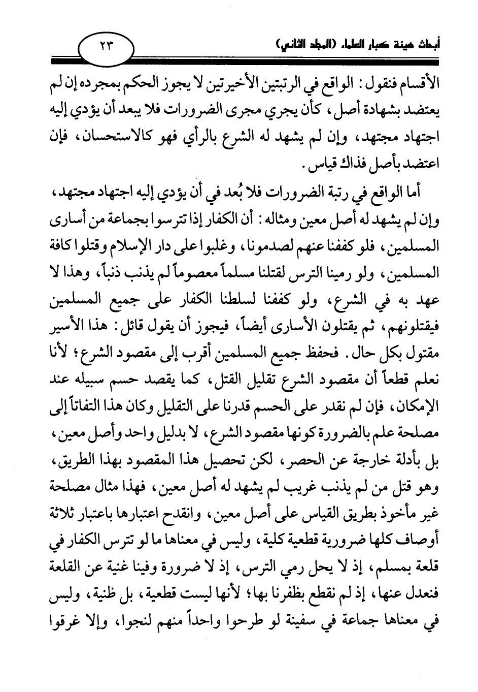 أما الواقع في رتبة الضرورات فلا بعد في أن يؤدي إليه اجتهاد مجتهد، وإن لم يشهد له أصل معين، ومثاله: أن الكفار إذا تترسوا بجماعة من أسارى المسلمين، فلو كففنا عنهم لصدمونا، وغلبوا على دار الإسلام وقتلوا كافة المسلمين، ولو رمينا الترس لقتلنا مسلما معصوما لم يذنب ذنبا، وهذا لا عهد به في الشرع، ولو كففنا لسلطنا الكفار على جميع المسلمين فيقتلونهم، ثم يقتلون الأسارى أيضا، فيجوز أن يقول قائل: هذا الأسير مقتول بكل حال.