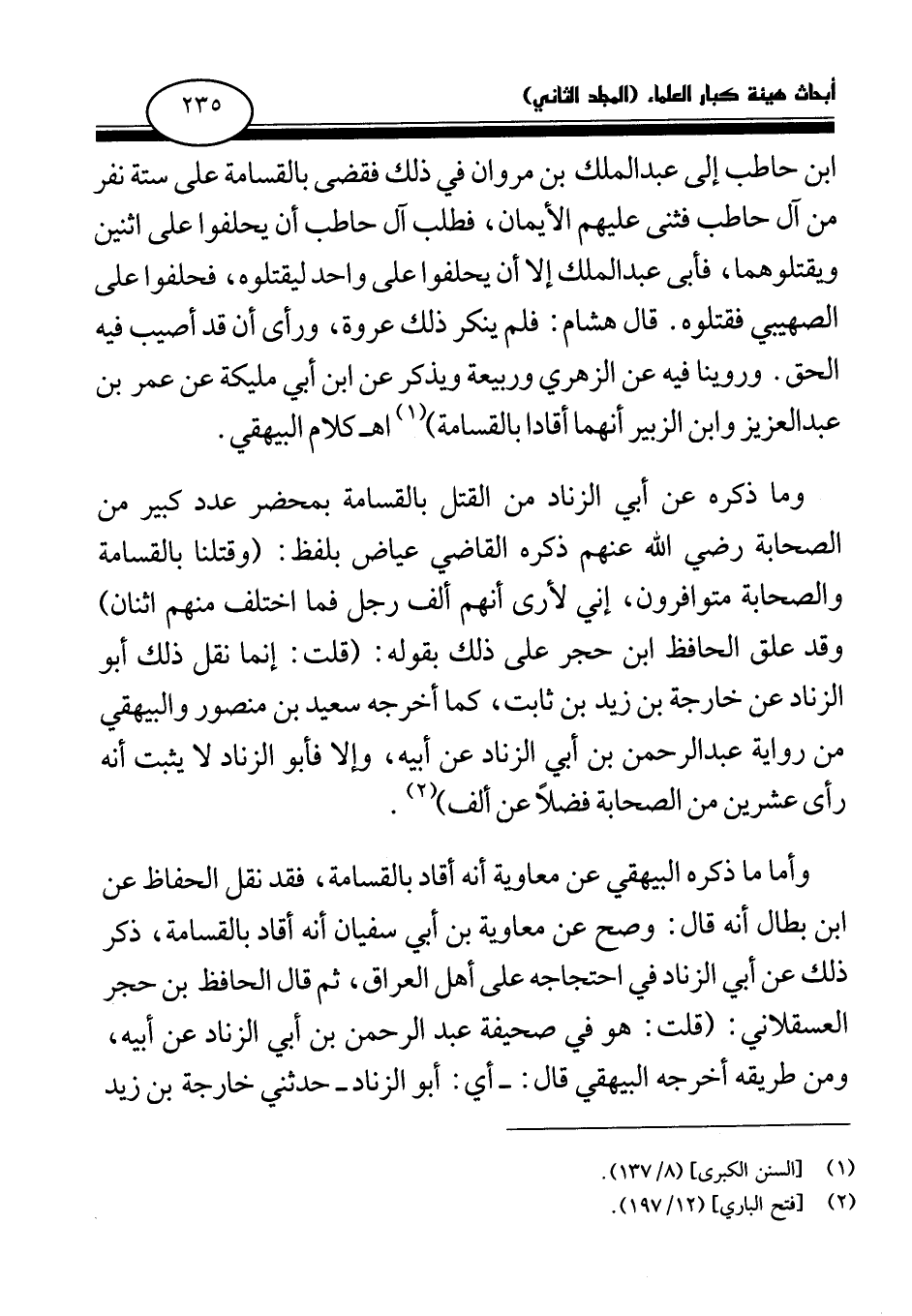 وما ذكره عن أبي الزناد من القتل بالقسامة بمحضر عدد كبير من الصحابة - رضي الله عنهم - ذكره القاضي عياض بلفظ: (وقتلنا بالقسامة والصحابة متوافرون، إني لأرى أنهم ألف رجل فما اختلف منهم اثنان) وقد علق الحافظ ابن حجر على ذلك بقوله: (قلت: إنما نقل ذلك أبو الزناد عن خارجة بن زيد بن ثابت، كما أخرجه سعيد بن منصور والبيهقي من رواية عبد الرحمن بن أبي الزناد عن أبيه، وإلا فأبو الزناد لا يثبت أنه رأى عشرين من الصحابة فضلا عن ألف) (¬2) .