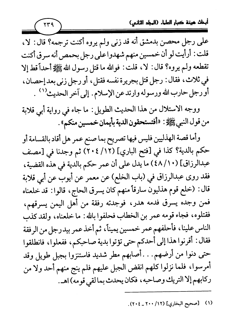 وأما قصة الهذليين فليس فيها تصريح بما صنع عمر هل أقاد بالقسامة أو حكم بالدية؟ كذا في [فتح الباري] (12\ 204) ثم وجدنا في [مصنف عبد الرزاق] (10\ 48) ما يدل على أن عمر حكم بالدية في هذه القضية، فقد روى عبد الرزاق في (باب الخلع) عن معمر عن أيوب عن أبي قلابة قال: (خلع قوم هذليون سارقا منهم كان يسرق الحاج، قالوا: قد خلعناه فمن وجده يسرق فدمه هدر، فوجدته رفقة من أهل اليمن يسرقهم، فقتلوه، فجاء قومه عمر بن الخطاب فحلفوا بالله: ما خلعناه، ولقد كذب الناس علينا، فأحلفهم عمر خمسين يمينا، ثم أخذ عمر بيد رجل من الرفقة فقال: أقرنوا هذا إلى أحدكم حتى تؤتوا بدية صاحبكم، ففعلوا، فانطلقوا حتى دنوا من أرضهم. . . أصابهم مطر شديد فاستنزوا بجبل طويل وقد أمرسوا، فلما نزلوا كلهم انقض الجبل عليهم فلم ينج منهم أحد ولا من ركابهم إلا التريك وصاحبه، فكان يحدث بما لقي قومه) اهـ.