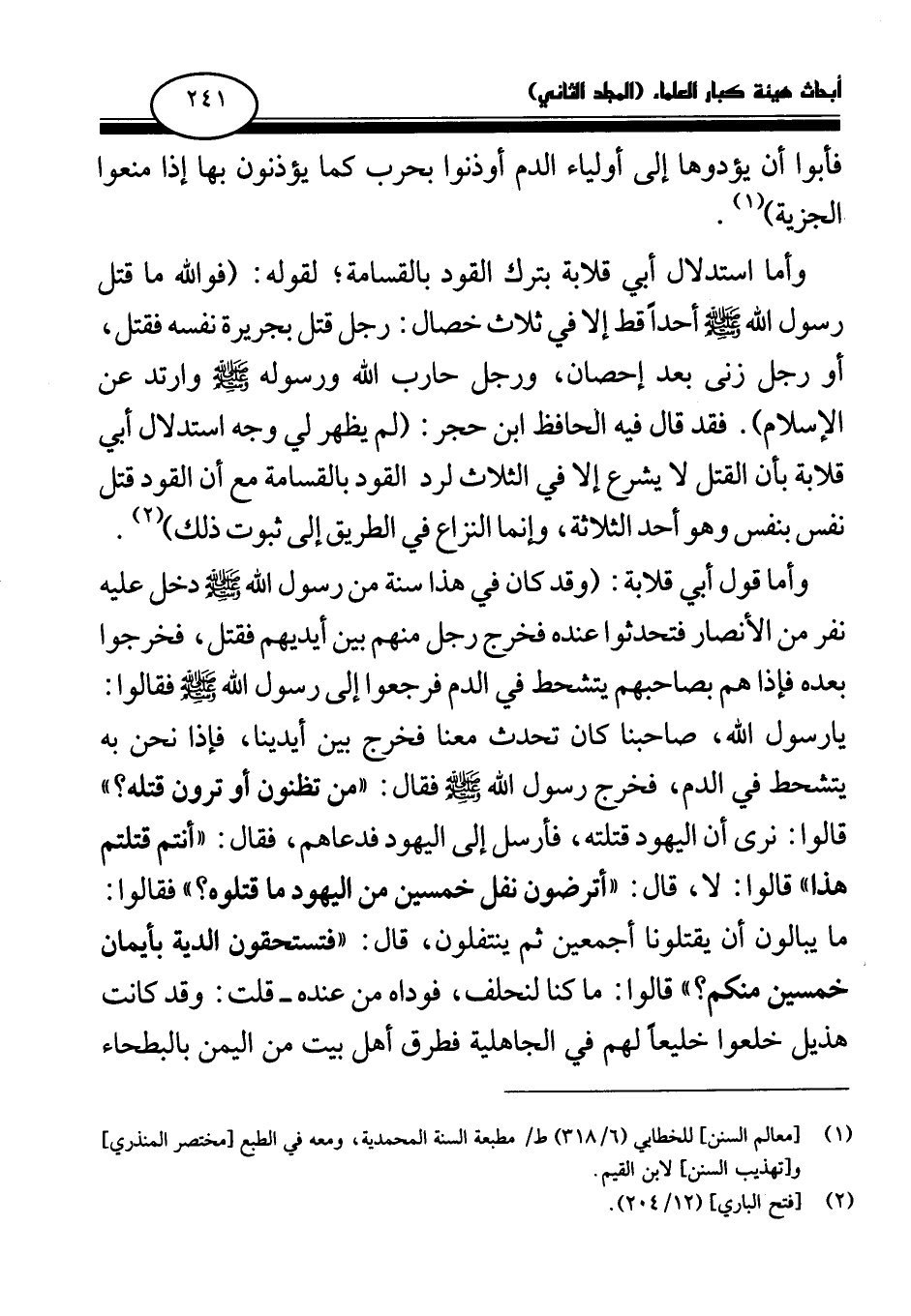 وأما قول أبي قلابة: «وقد كان في هذا سنة من رسول الله - صلى الله عليه وسلم - دخل عليه نفر من الأنصار فتحدثوا عنده فخرج رجل منهم بين أيديهم فقتل، فخرجوا بعده فإذا هم بصاحبهم يتشحط في الدم، فرجعوا إلى رسول الله - صلى الله عليه وسلم - فقالوا: يا رسول الله، صاحبنا كان تحدث معنا فخرج بين أيدينا، فإذا نحن به يتشحط في الدم، فخرج رسول الله - صلى الله عليه وسلم - فقال: من تظنون أو ترون قتله؟ قالوا: نرى أن اليهود قتلته، فأرسل إلى اليهود فدعاهم، فقال: أنتم قتلتم هذا قالوا: لا، قال: أترضون نفل خمسين من اليهود ما قتلوه؟ فقالوا: ما يبالون أن يقتلونا أجمعين ثم ينتفلون، قال: فتستحقون الدية بأيمان خمسين منكم؟ قالوا: ما كنا لنحلف، فوداه من عنده - قلت: وقد كانت هذيل خلعوا خليعا لهم في الجاهلية فطرق أهل بيت من اليمن بالبطحاء