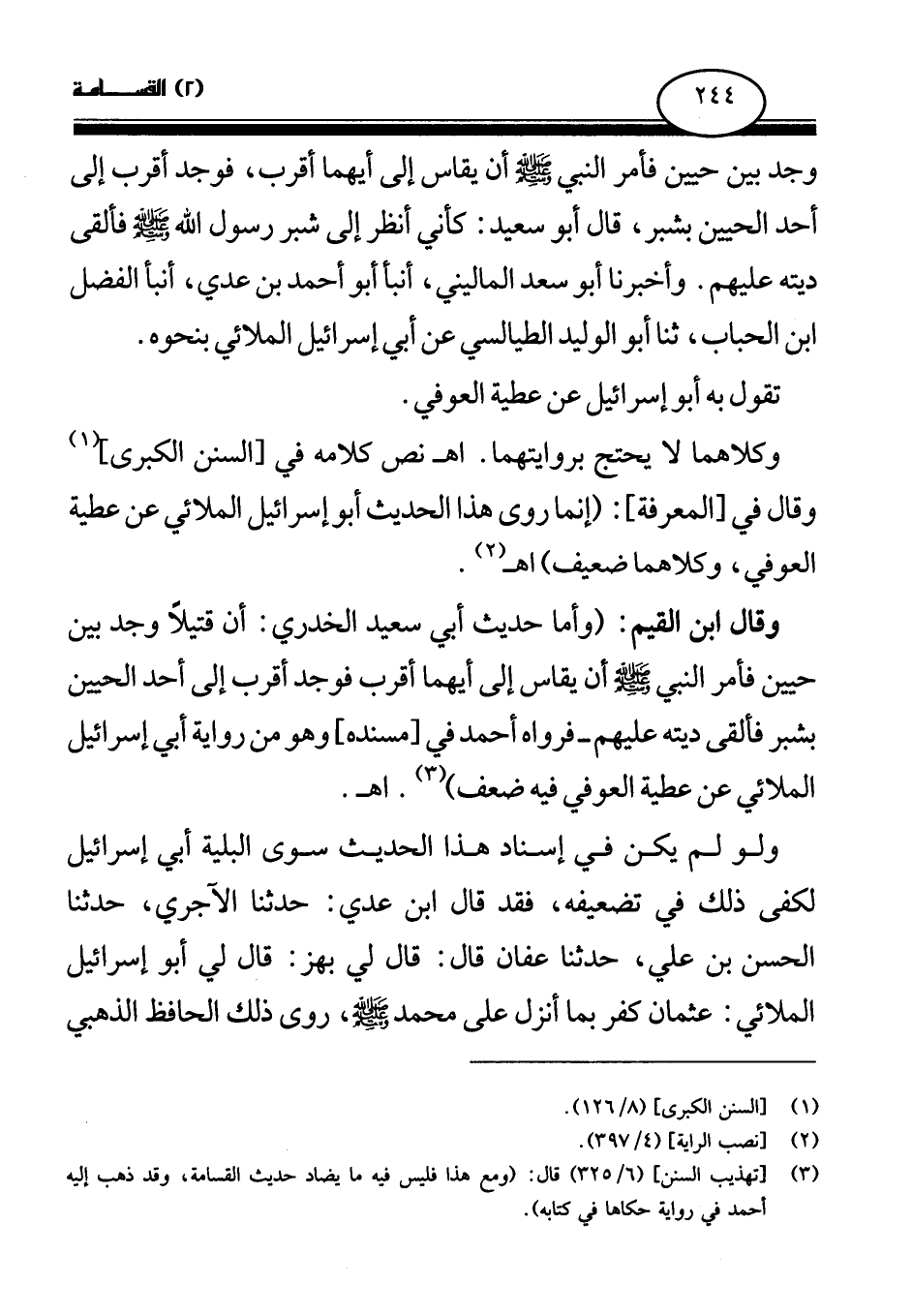 وقال ابن القيم: (وأما حديث أبي سعيد الخدري: «أن قتيلا وجد بين حيين فأمر النبي - صلى الله عليه وسلم - أن يقاس إلى أيهما أقرب فوجد أقرب إلى أحد الحيين بشبر فألقى ديته عليهم (¬4) » - فرواه أحمد في [مسنده] وهو من رواية أبي إسرائيل الملائي عن عطية العوفي فيه ضعف) . اهـ. .