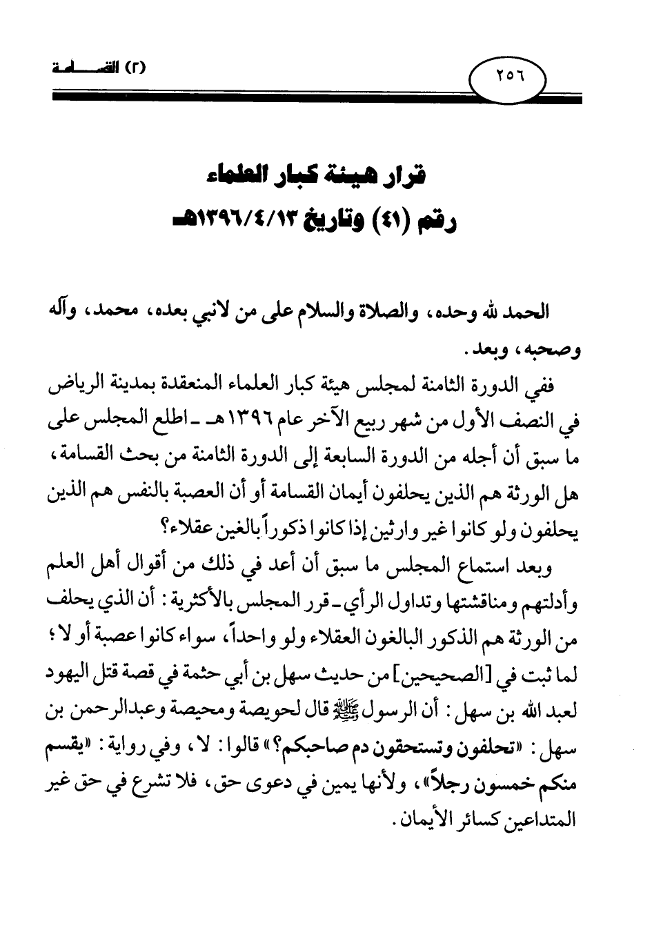ففي الدورة الثامنة لمجلس هيئة كبار العلماء المنعقدة بمدينة الرياض في النصف الأول من شهر ربيع الآخر عام 1396 هـ - اطلع المجلس على ما سبق أن أجله من الدورة السابعة إلى الدورة الثامنة من بحث القسامة، هل الورثة هم الذين يحلفون أيمان القسامة أو أن العصبة بالنفس هم الذين يحلفون ولو كانوا غير وارثين إذا كانوا ذكورا بالغين عقلاء؟ .