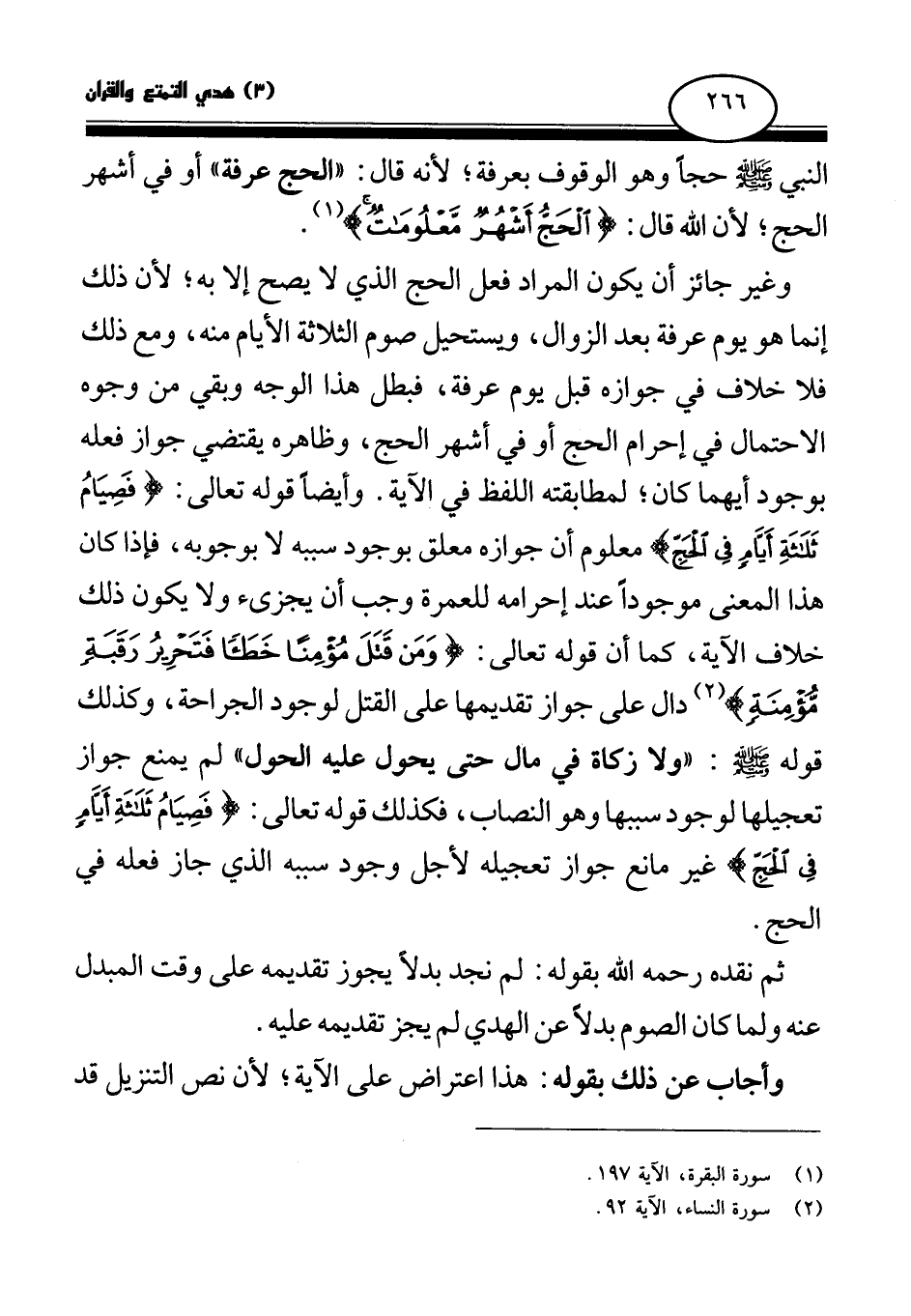 وغير جائز أن يكون المراد فعل الحج الذي لا يصح إلا به؛ لأن ذلك إنما هو يوم عرفة بعد الزوال، ويستحيل صوم الثلاثة الأيام منه، ومع ذلك فلا خلاف في جوازه قبل يوم عرفة، فبطل هذا الوجه وبقي من وجوه الاحتمال في إحرام الحج أو في أشهر الحج، وظاهره يقتضي جواز فعله بوجود أيهما كان؛ لمطابقته اللفظ في الآية. وأيضا قوله تعالى: {فَصِيَامُ ثَلَاثَةِ أَيَّامٍ فِي الْحَجِّ} (¬3) معلوم أن جوازه معلق بوجود سببه لا بوجوبه، فإذا كان هذا المعنى موجودا عند إحرامه للعمرة وجب أن يجزئ ولا يكون ذلك خلاف الآية، كما أن قوله تعالى: {وَمَنْ قَتَلَ مُؤْمِنًا خَطَأً فَتَحْرِيرُ رَقَبَةٍ مُؤْمِنَةٍ} (¬4) دال على جواز تقديمها على القتل لوجود الجراحة، وكذلك قوله صلى الله عليه وسلم: «ولا زكاة في مال حتى يحول عليه الحول (¬5) » لم يمنع جواز تعجيلها لوجود سببها وهو النصاب، فكذلك قوله تعالى: {فَصِيَامُ ثَلَاثَةِ أَيَّامٍ فِي الْحَجِّ} (¬6) غير مانع جواز تعجيله لأجل وجود سببه الذي جاز فعله في الحج.