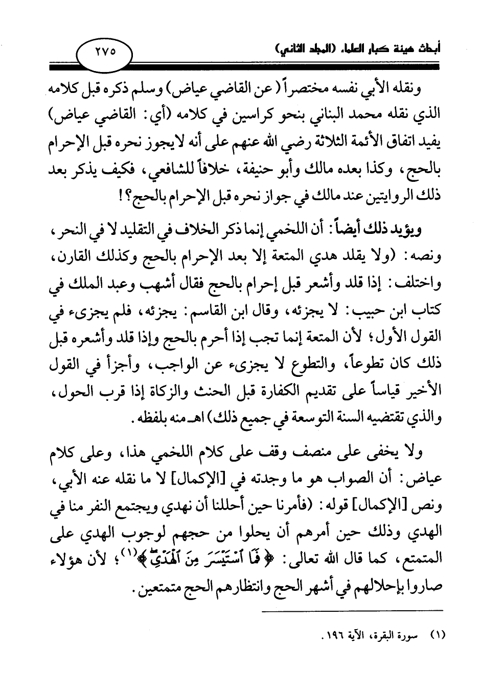 ونقله الأبي نفسه مختصرا (عن القاضي عياض) وسلم ذكره قبل كلامه الذي نقله محمد البناني بنحو كراسين في كلامه (أي: القاضي عياض) يفيد اتفاق الأئمة الثلاثة رضي الله عنهم على أنه لا يجوز نحره قبل الإحرام بالحج، وكذا بعده مالك وأبو حنيفة، خلافا للشافعي، فكيف يذكر بعد ذلك الروايتين عند مالك في جواز نحره قبل الإحرام بالحج؟!