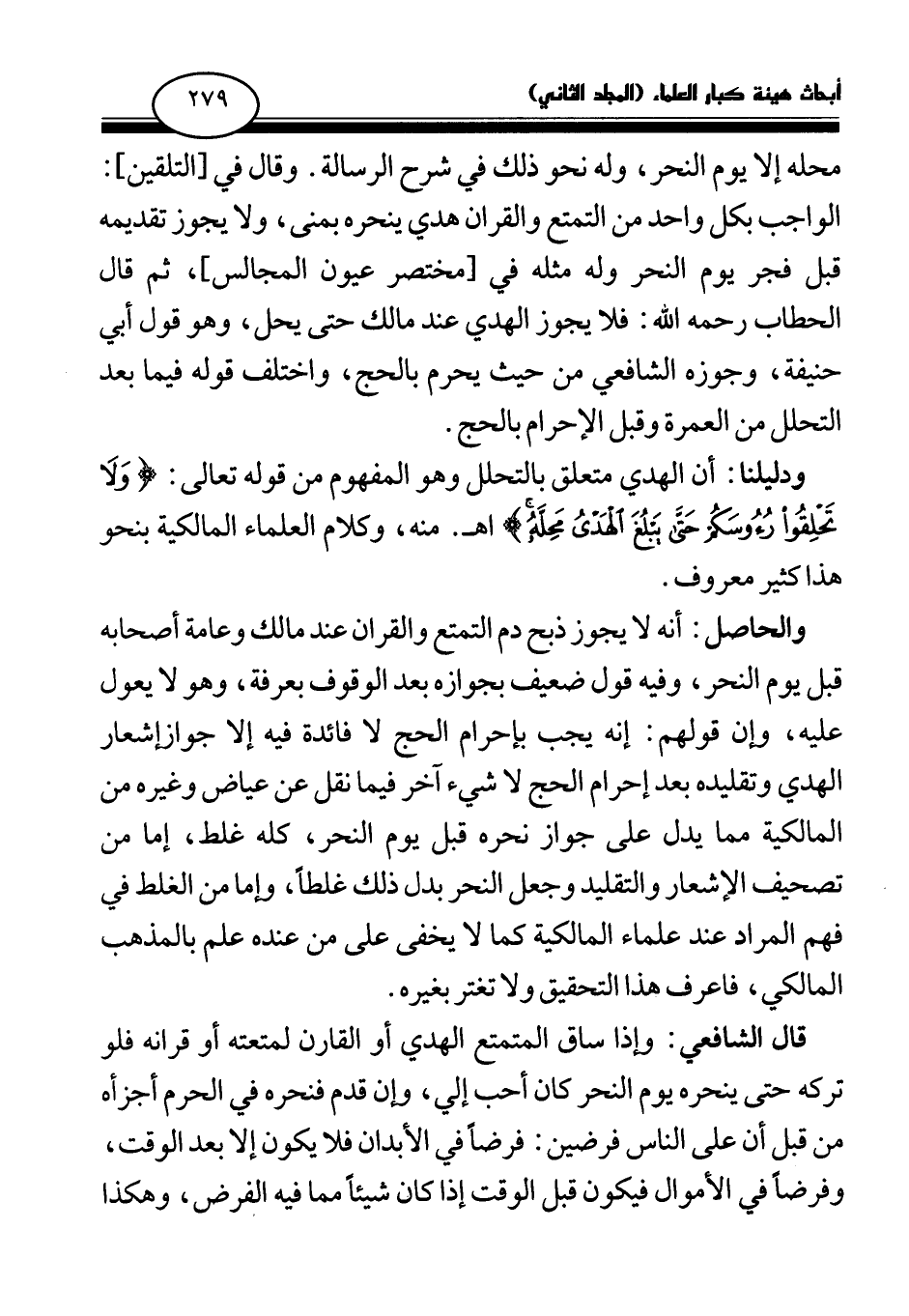 ودليلنا: أن الهدي متعلق بالتحلل وهو المفهوم من قوله تعالى: {وَلَا تَحْلِقُوا رُءُوسَكُمْ حَتَّى يَبْلُغَ الْهَدْيُ مَحِلَّهُ} (¬1) اهـ. منه، وكلام العلماء المالكية بنحو هذا كثير معروف.