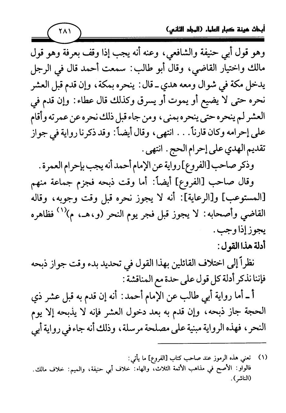 وقال صاحب [الفروع] أيضا: أما وقت ذبحه فجزم جماعة منهم [المستوعب] و [الرعاية] : أنه لا يجوز نحره قبل وقت وجوبه، وقاله القاضي وأصحابه: لا يجوز قبل فجر يوم النحو (و، هـ، م) فظاهره يجوز إذا وجب.