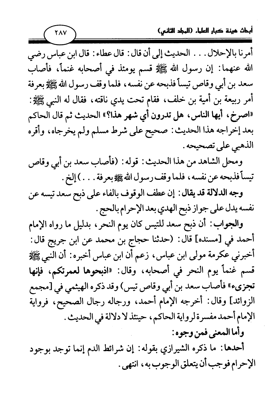 ابن جريج قال: أخبرني عكرمة مولى ابن عباس، زعم أن ابن عباس أخبره: «أن النبي صلى الله عليه وسلم قسم غنما يوم النحر في أصحابه، وقال: اذبحوها لعمرتكم، فإنها تجزئ فأصاب سعد بن أبي وقاص تيس (¬1) » وقد ذكره الهيثمي في [مجمع الزوائد] وقال: أخرجه الإمام أحمد، ورجاله رجال الصحيح، فرواية الإمام أحمد مفسرة لرواية الحاكم، حينئذ لا دلالة في الحديث.