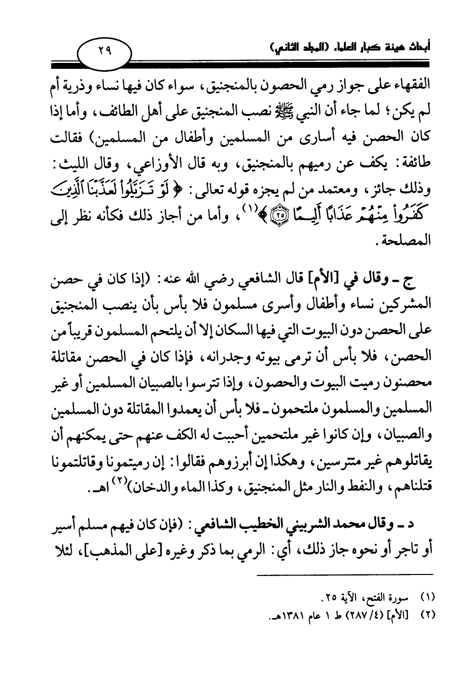 ج- وقال في [الأم] قال الشافعي رضي الله عنه: (إذا كان في حصن المشركين نساء وأطفال وأسرى مسلمون، فلا بأس بأن ينصب المنجنيق على الحصن دون البيوت التي فيها السكان إلا أن يلتحم المسلمون قريبا من الحصن، فلا بأس أن ترمى بيوته وجدرانه، فإذا كان في الحصن مقاتلة محصنون رميت البيوت والحصون، وإذا تترسوا بالصبيان المسلمين أو غير المسلمين والمسلمون ملتحمون - فلا بأس أن يعمدوا المقاتلة دون المسلمين والصبيان، وإن كانوا غير ملتحمين أحببت له الكف عنهم حتى يمكنهم أن يقاتلوهم غير متترسين، وهكذا إن أبرزوهم فقالوا: إن رميتمونا وقاتلتمونا قتلناهم، والنفط والنار مثل المنجنيق، وكذا الماء والدخان) (¬2) اهـ.
