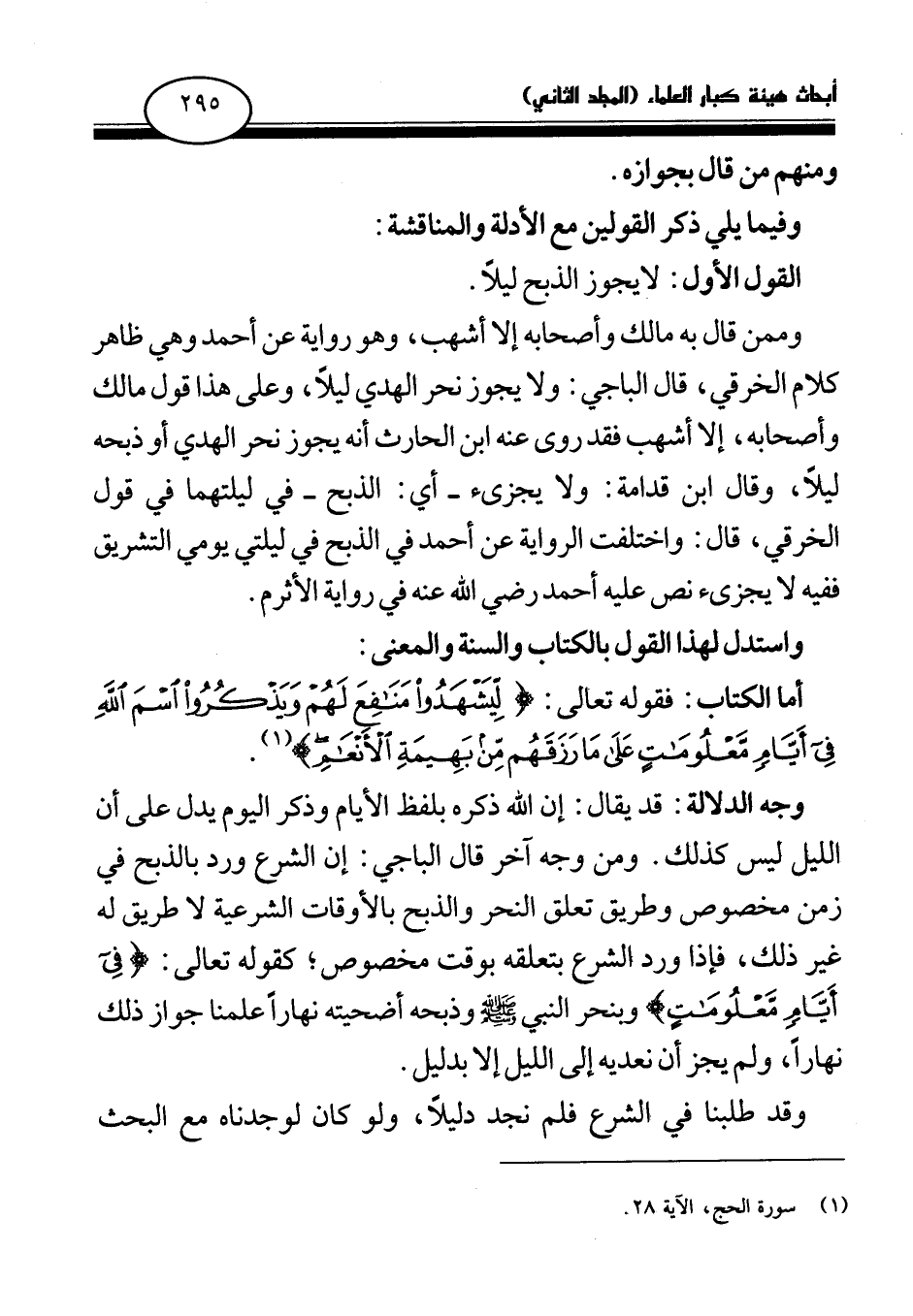 وممن قال به مالك وأصحابه إلا أشهب، وهو رواية عن أحمد وهي ظاهر كلام الخرقي، قال الباجي: ولا يجوز نحر الهدي ليلا، وعلى هذا قول مالك وأصحابه، إلا أشهب فقد روى عنه ابن الحارث أنه يجوز نحر الهدي أو ذبحه ليلا، وقال ابن قدامة: ولا يجزئ- أي: الذبح- في ليلتهما في قول الخرقي، قال: واختلفت الرواية عن أحمد في الذبح في ليلتي يومي التشريق ففيه لا يجزئ نص عليه أحمد رضي الله عنه في رواية الأثرم.