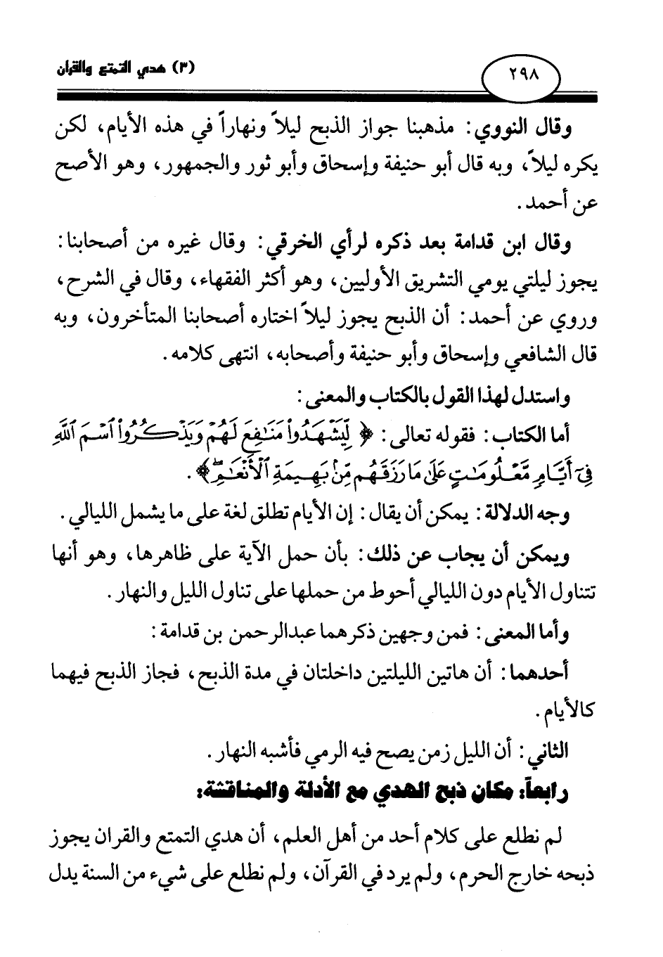 وقال ابن قدامة بعد ذكره لرأى الخرقي: وقال غيره من أصحابنا: يجوز ليلتي يومي التشريق الأوليين، وهو أكثر الفقهاء، وقال في الشرح، وروي عن أحمد: أن الذبح يجوز ليلا اختاره أصحابنا المتأخرون، وبه قال الشافعي وإسحاق وأبو حنيفة وأصحابه، انتهى كلامه.