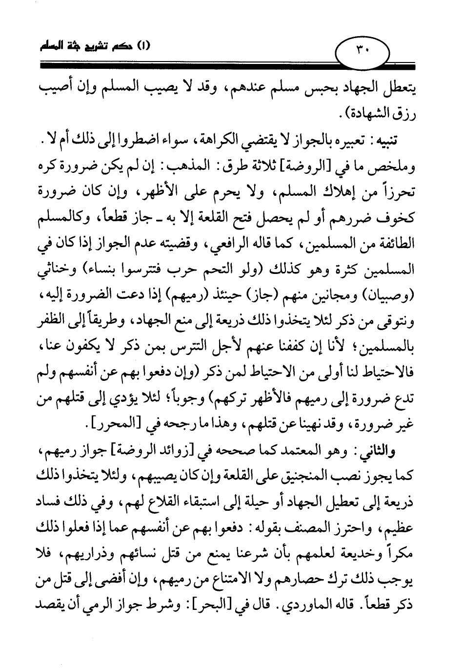تنبيه: تعبيره بالجواز لا يقتضي الكراهة، سواء اضطروا إلى ذلك أم لا. وملخص ما في [الروضة] ثلاثة طرق: المذهب: إن لم يكن ضرورة كره تحرزا من إهلاك المسلم، ولا يحرم على الأظهر، وإن كان ضرورة كخوف ضررهم، أو لم يحصل فتح القلعة إلا به - جاز قطعا، وكالمسلم الطائفة من المسلمين، كما قاله الرافعي، وقضيته عدم الجواز إذا كان في المسلمين كثرة وهو كذلك (ولو التحم حرب فتترسوا بنساء) وخناثي (وصبيان) ومجانين منهم (جاز) حينئذ (رميهم) إذا دعت الضرورة إليه، ونتوقى من ذكر؛ لئلا يتخذوا ذلك ذريعة إلى منع الجهاد، وطريقا إلى الظفر بالمسلمين؛ لأنا إن كففنا عنهم لأجل التترس بمن ذكر لا يكفون عنا، فالاحتياط لنا أولى من الاحتياط لمن ذكر (وإن دفعوا بهم عن أنفسهم ولم تدع ضرورة إلى رميهم فالأظهر تركهم) وجوبا؛ لئلا يؤدي إلى قتلهم من غير ضرورة، وقد نهينا عن قتلهم، وهذا ما رجحه في [المحرر] .