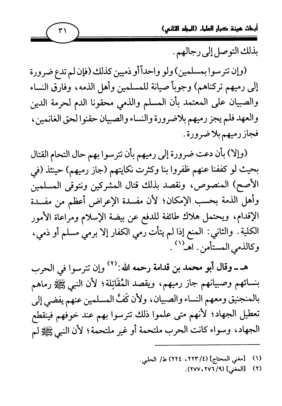 هـ - وقال أبو محمد بن قدامة رحمه الله: (¬2) وإن تترسوا في الحرب بنسائهم وصبيانهم جاز رميهم، ويقصد المقاتلة؛ لأن النبي صلى الله عليه وسلم رماهم بالمنجنيق ومعهم النساء والصبيان، ولأن كف المسلمين عنهم يفضي إلى تعطيل الجهاد؛ لأنهم متى علموا ذلك تترسوا بهم عند خوفهم فينقطع الجهاد، وسواء كانت الحرب ملتحمة أو غير ملتحمة؛ لأن النبي صلى الله عليه وسلم لم